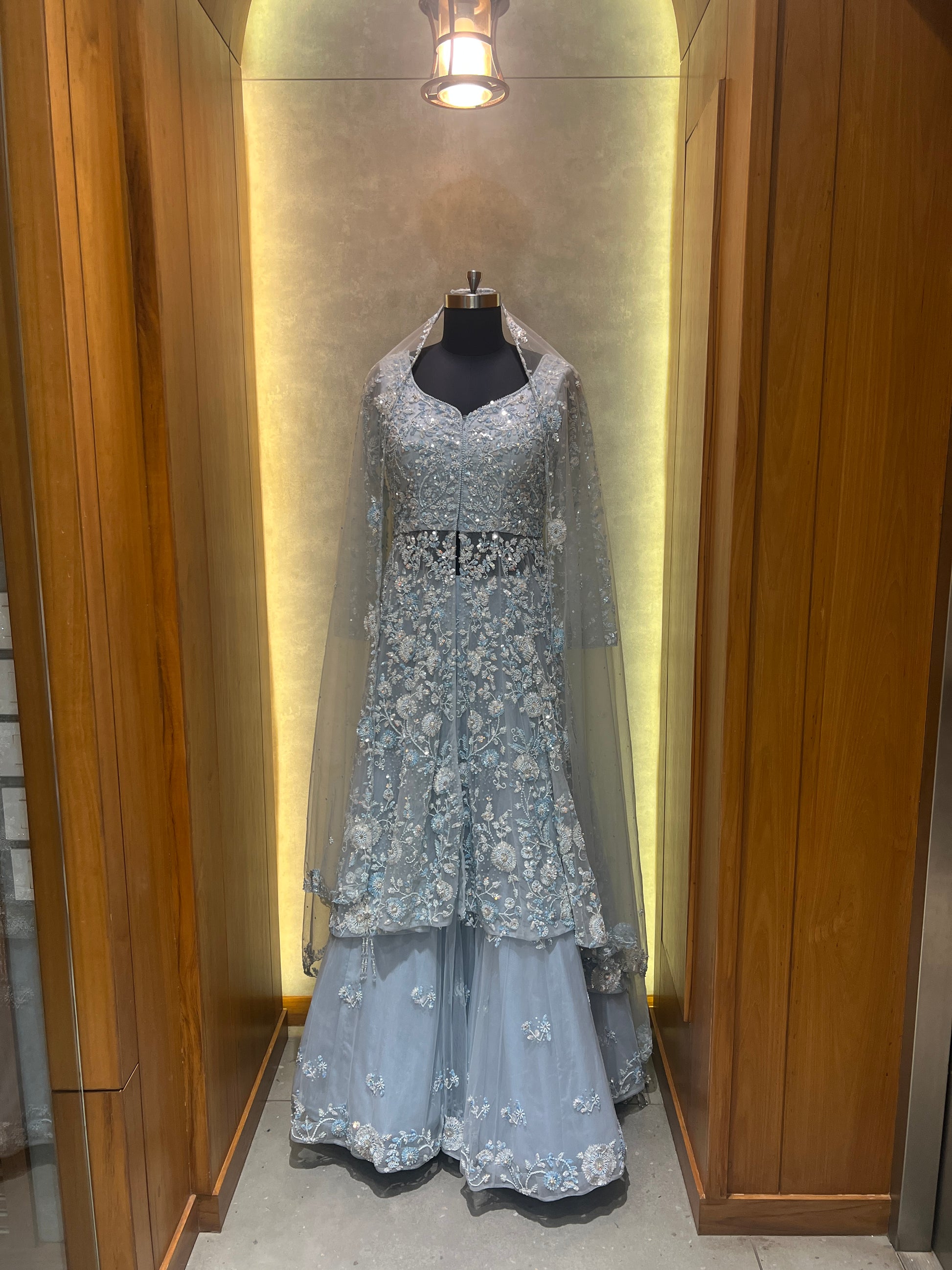 Step into elegance with this powder blue sharara set, featuring intricate floral embroidery and delicate sequin work. The long jacket-style kurta adds a modern touch, while the matching net dupatta completes the graceful look — perfect for weddings, receptions, and festive soirées.