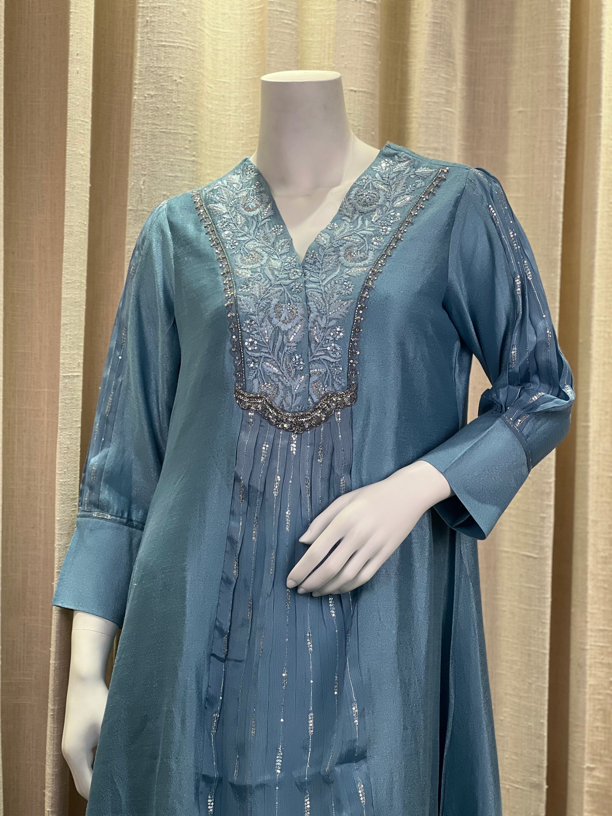 Embrace understated elegance with this powder blue kurti set, thoughtfully crafted for festive charm. The kurti features delicate sequin work on the front panel, adding a graceful shimmer without overpowering the look. Soft pleats fall from the yoke, giving a flowy silhouette, while the V-neck and cuffed sleeves offer a refined touch.
