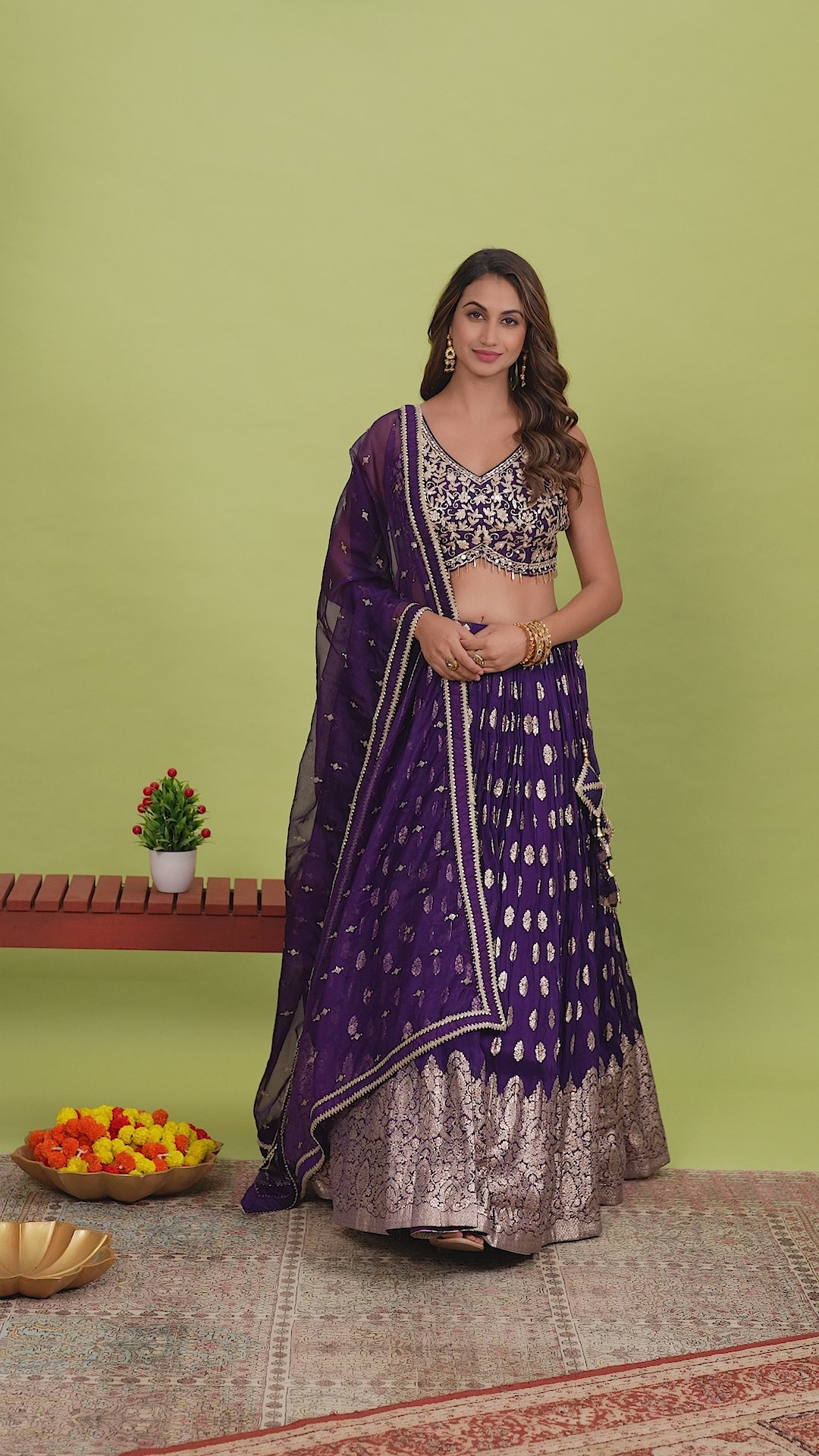 This vibrant Purple Embroidered Lehenga Choli is the perfect addition to your wardrobe. Made with high-quality georgette fabric, it features intricate embroidery for a stunning look. Stand out in any event with this unique and stylish outfit!