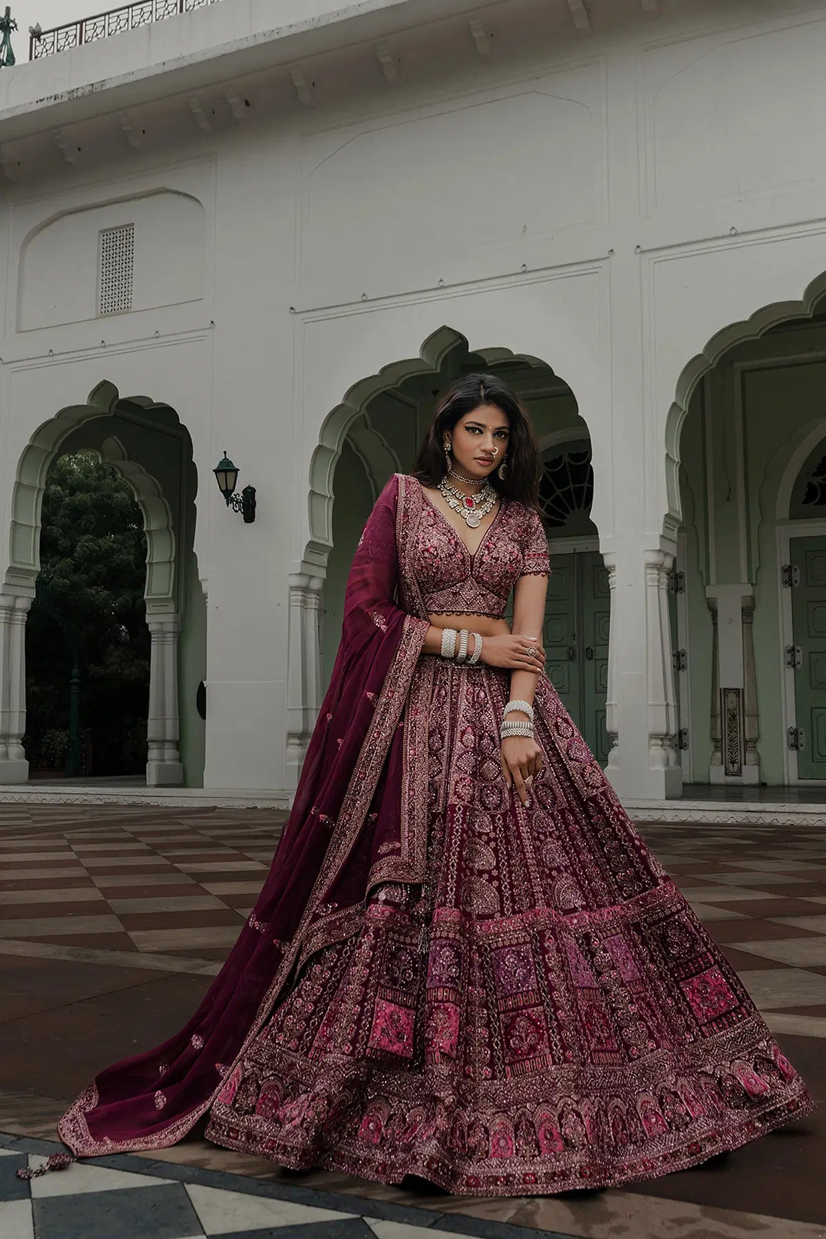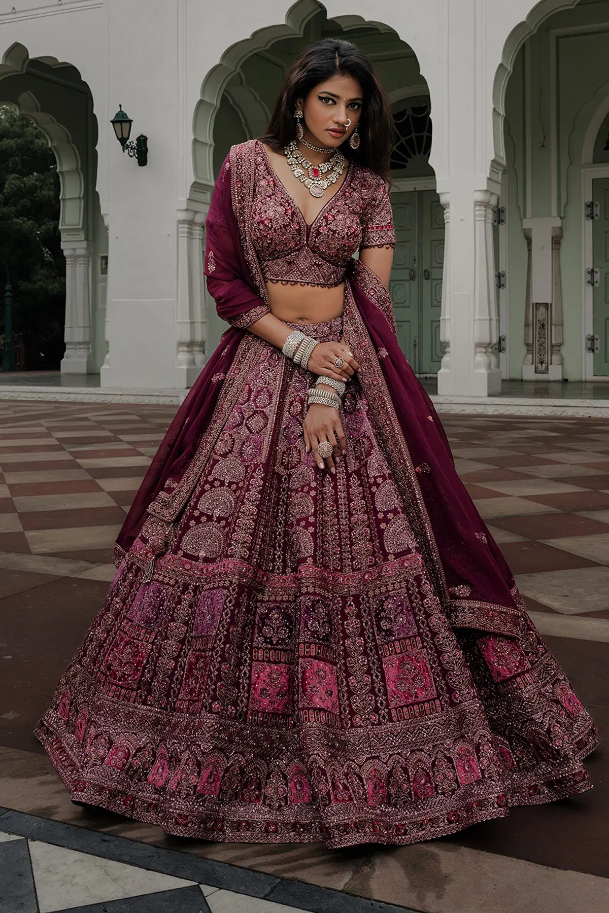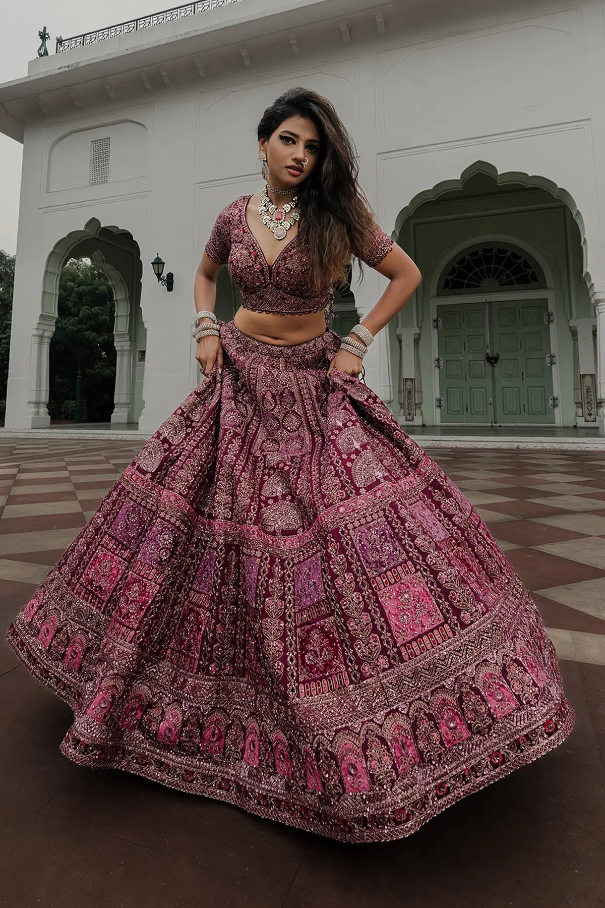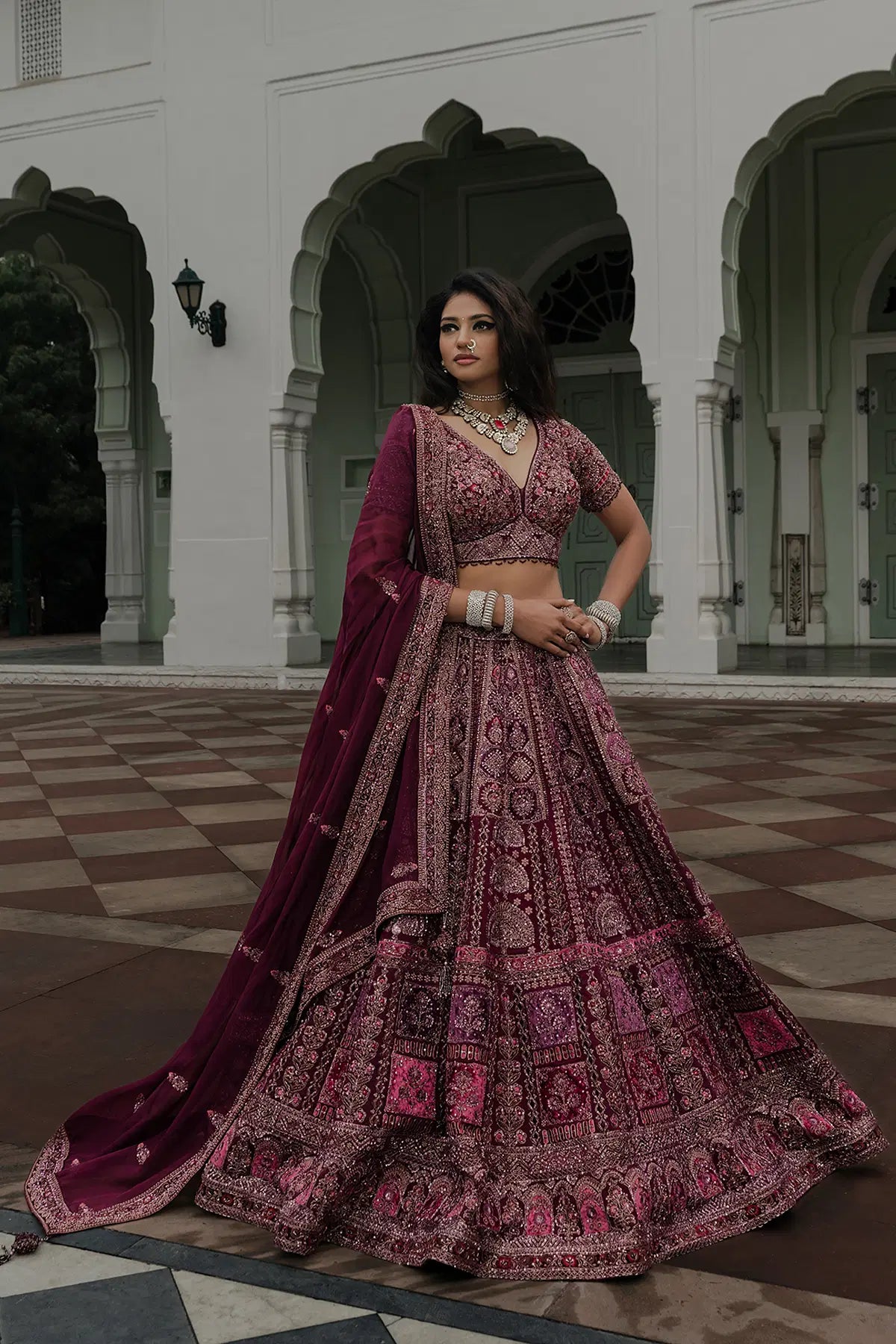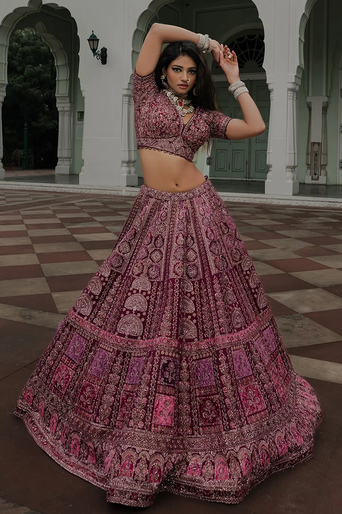 Grace meets grandeur in this rich Wine Purple Bridal Lehenga, crafted in pure crepe with a flowy umbrella silhouette. Adorned with detailed Resham, Sequins, Pearl, Cutdana, Zardosi, and Zari work, this piece is a true celebration of heritage craftsmanship.