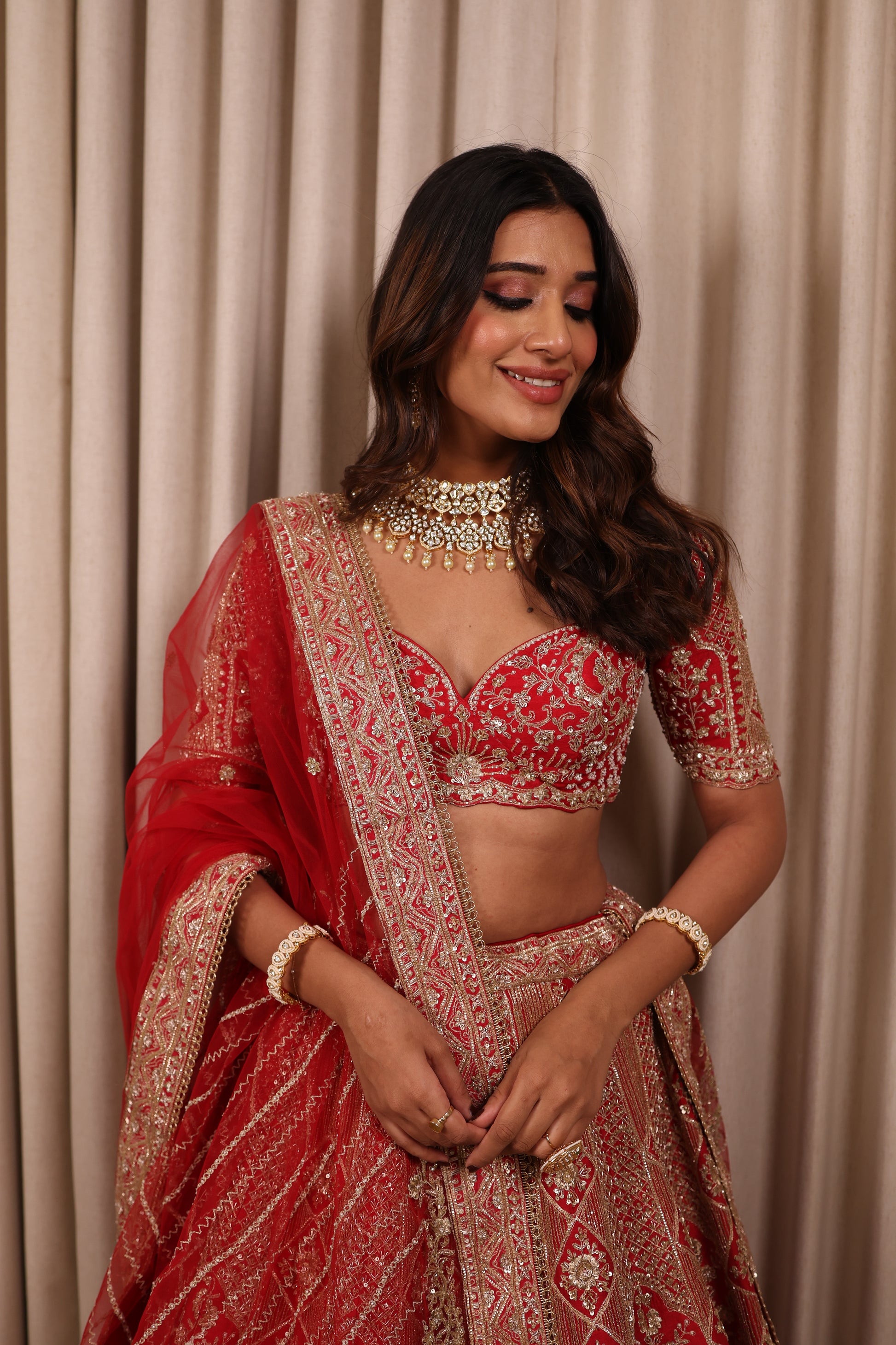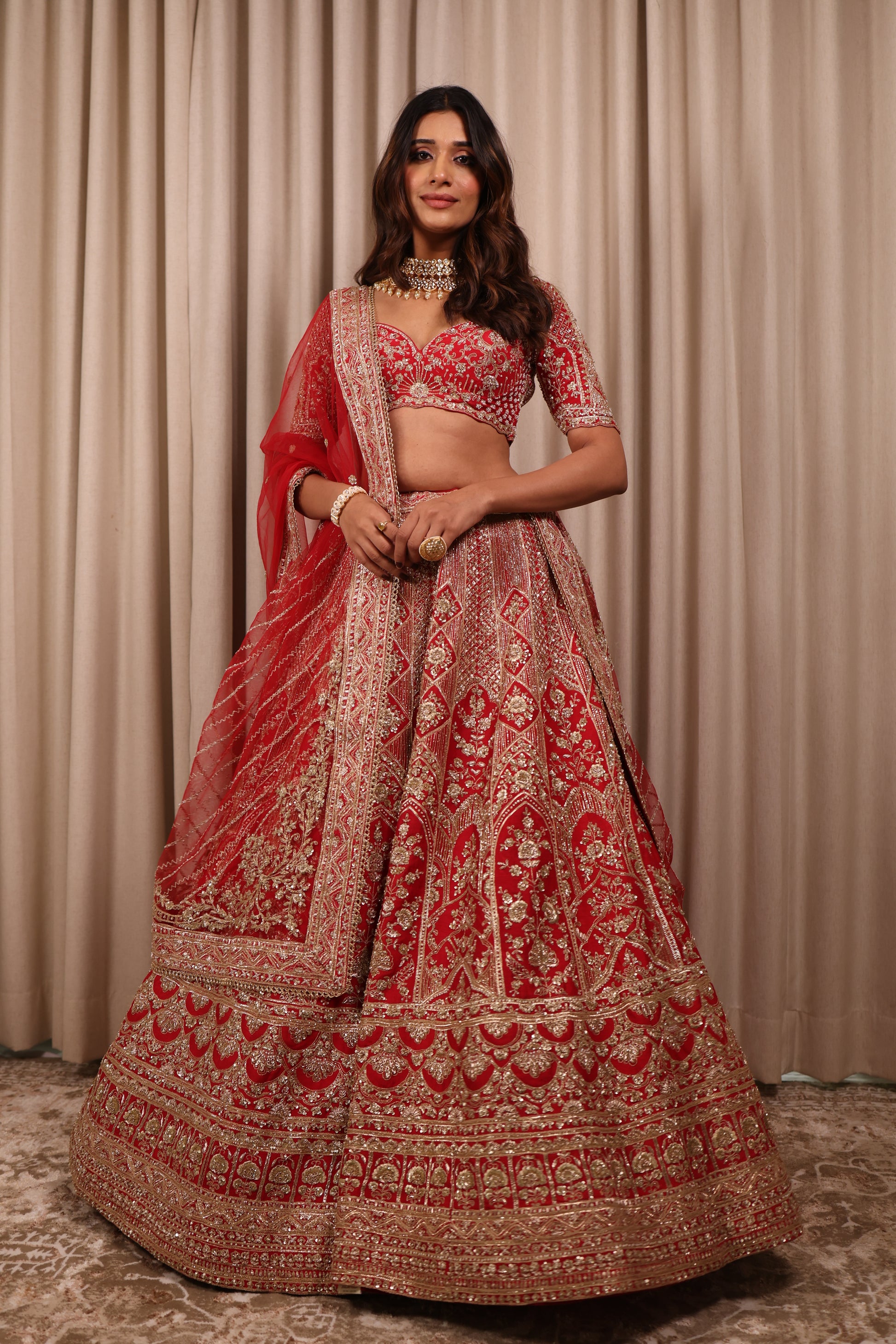 Get ready to stun in this Red Embroidered Bridal Lehenga! With its intricate embroidery and dazzling color, this lehenga will make you feel like a queen on your special day. Lightweight and comfortable, you can dance the night away without any restrictions. Say "I do" to this gorgeous lehenga now!