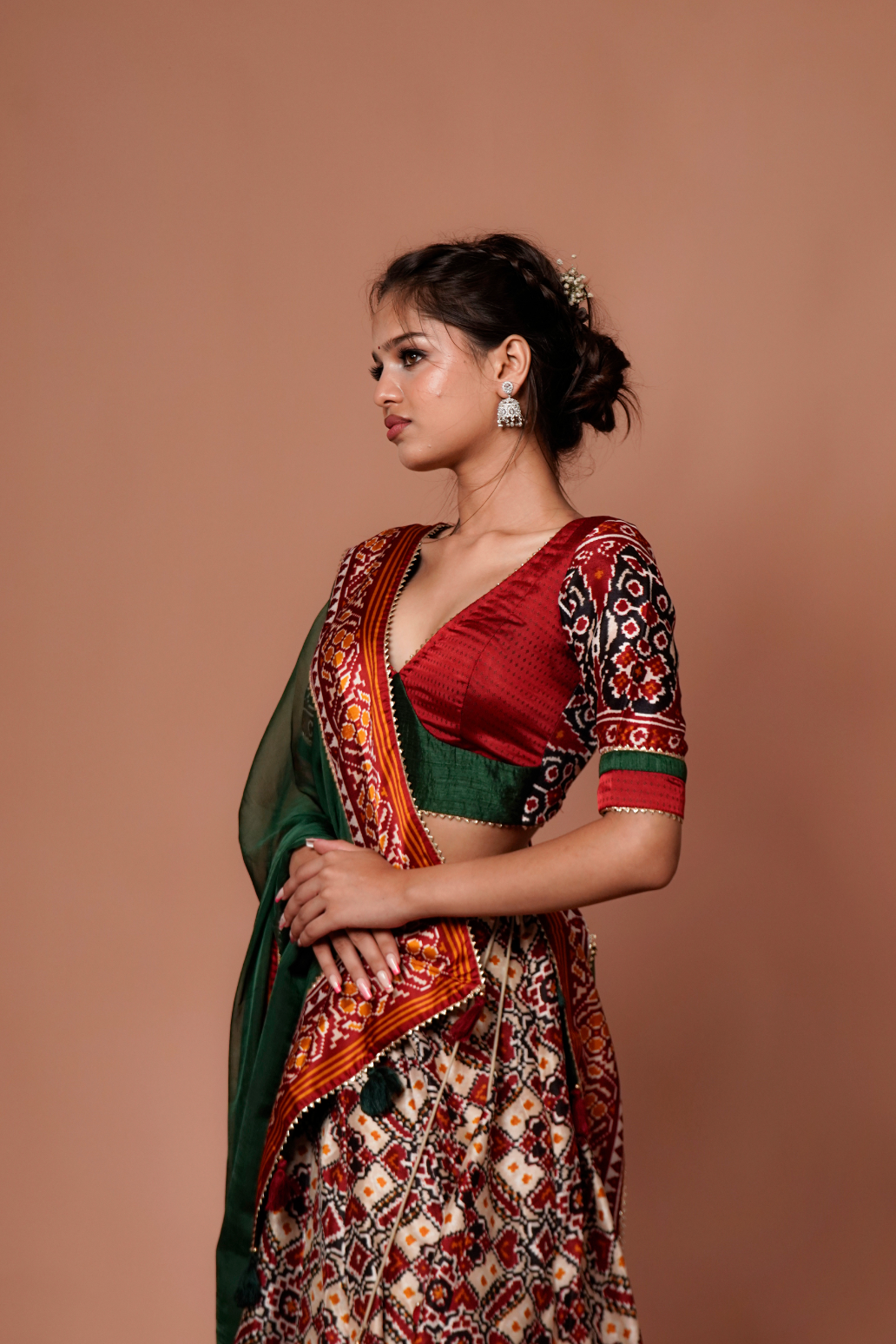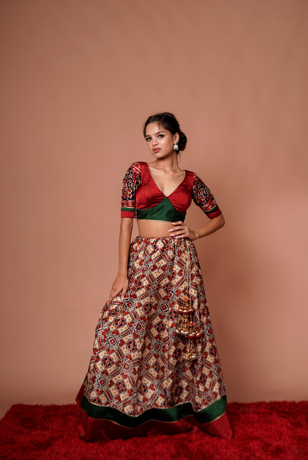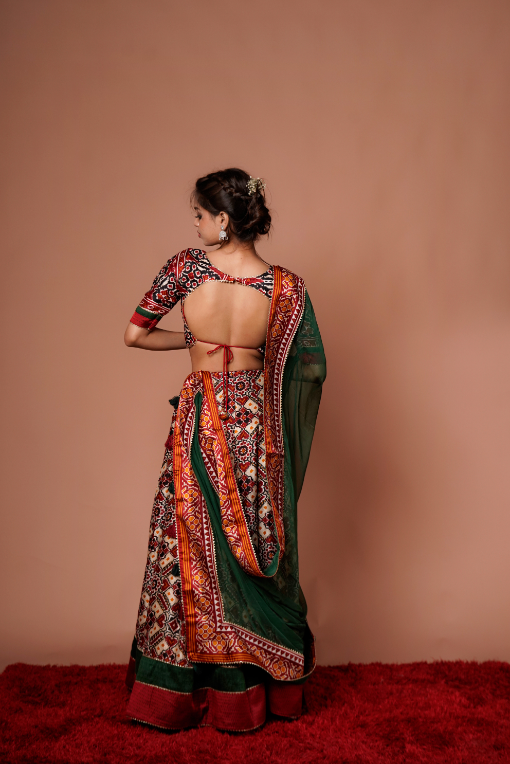 Get ready to spice up your wardrobe with our Red & Green Bandhani Printed Chanaya Choli! This unique piece features a vibrant red and green print that will make you stand out from the crowd. Perfect for any special occasion, this choli will add a touch of playfulness and style to your outfit!