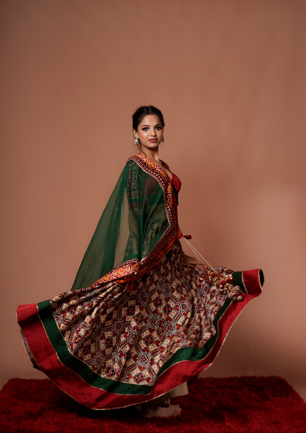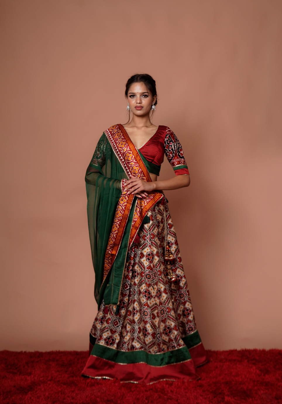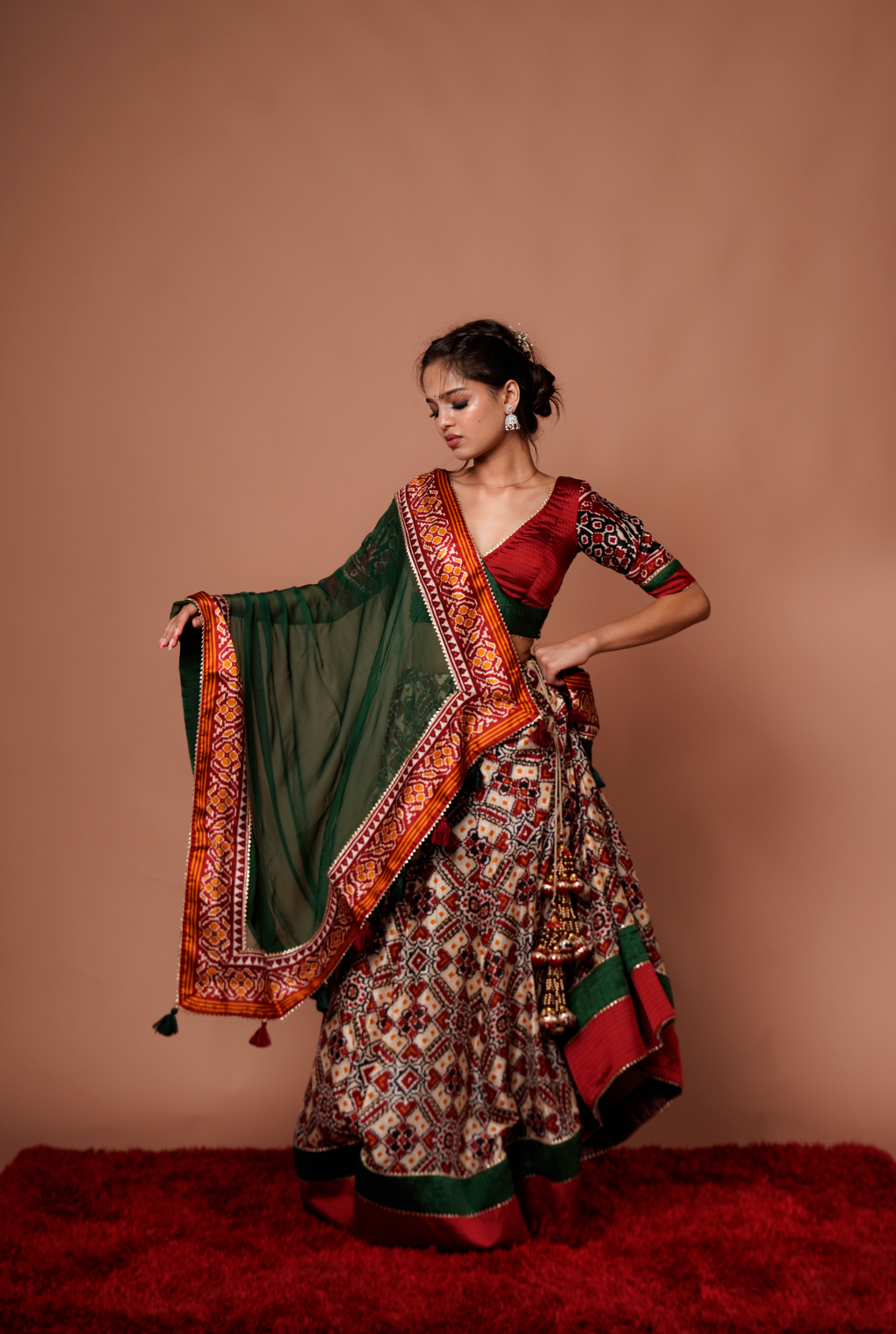 Get ready to spice up your wardrobe with our Red & Green Bandhani Printed Chanaya Choli! This unique piece features a vibrant red and green print that will make you stand out from the crowd. Perfect for any special occasion, this choli will add a touch of playfulness and style to your outfit!