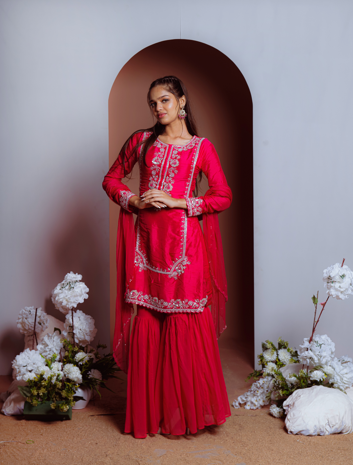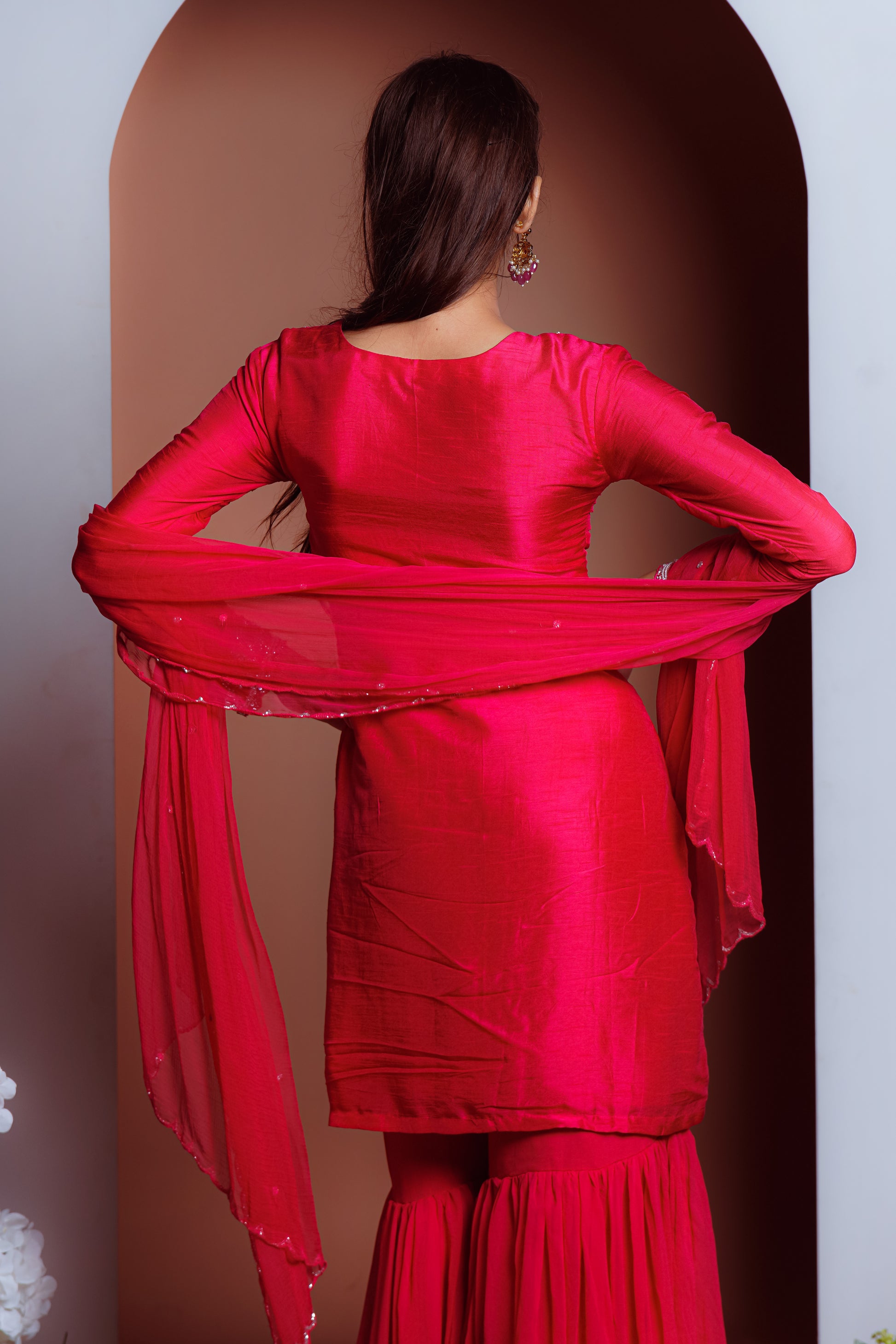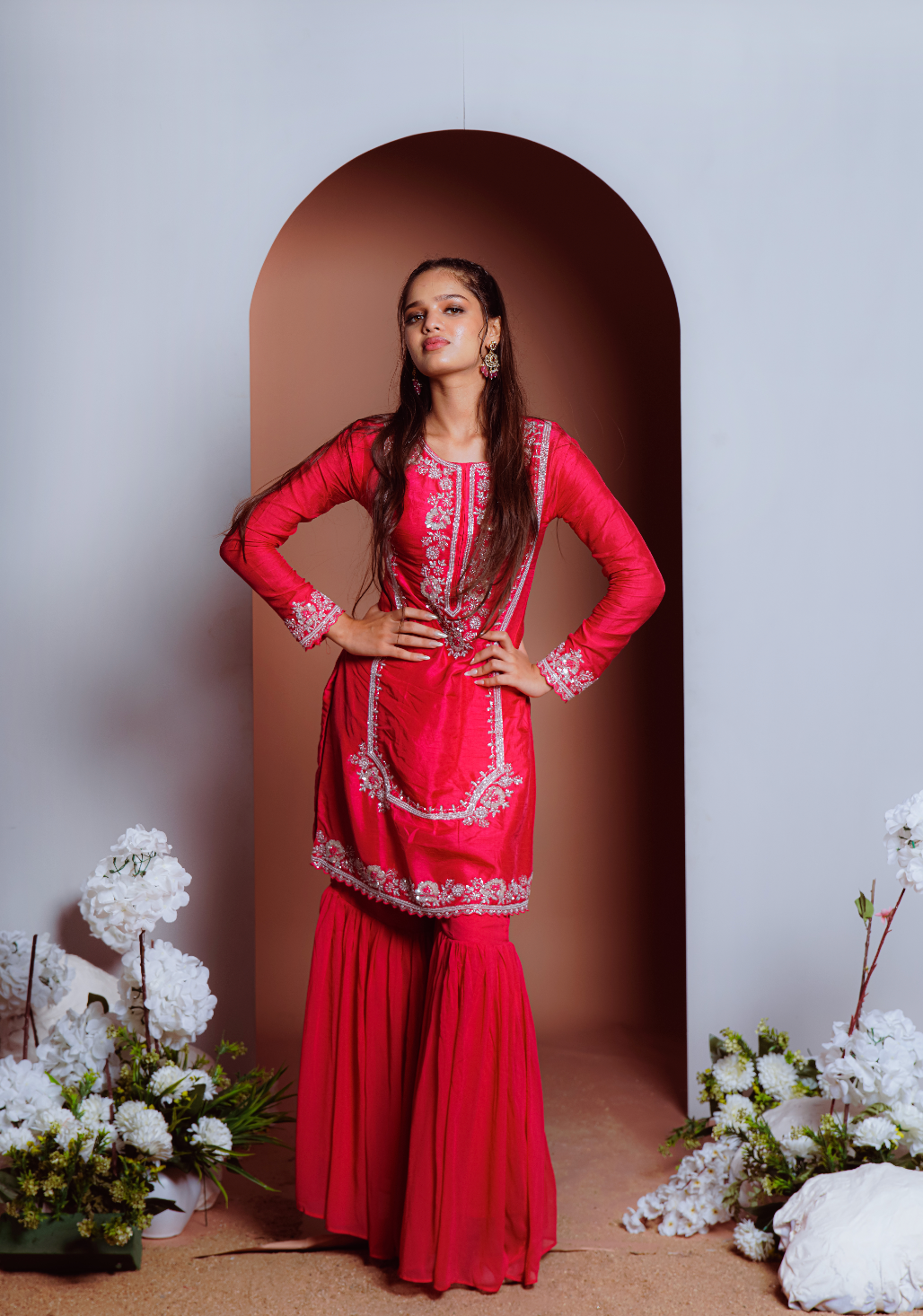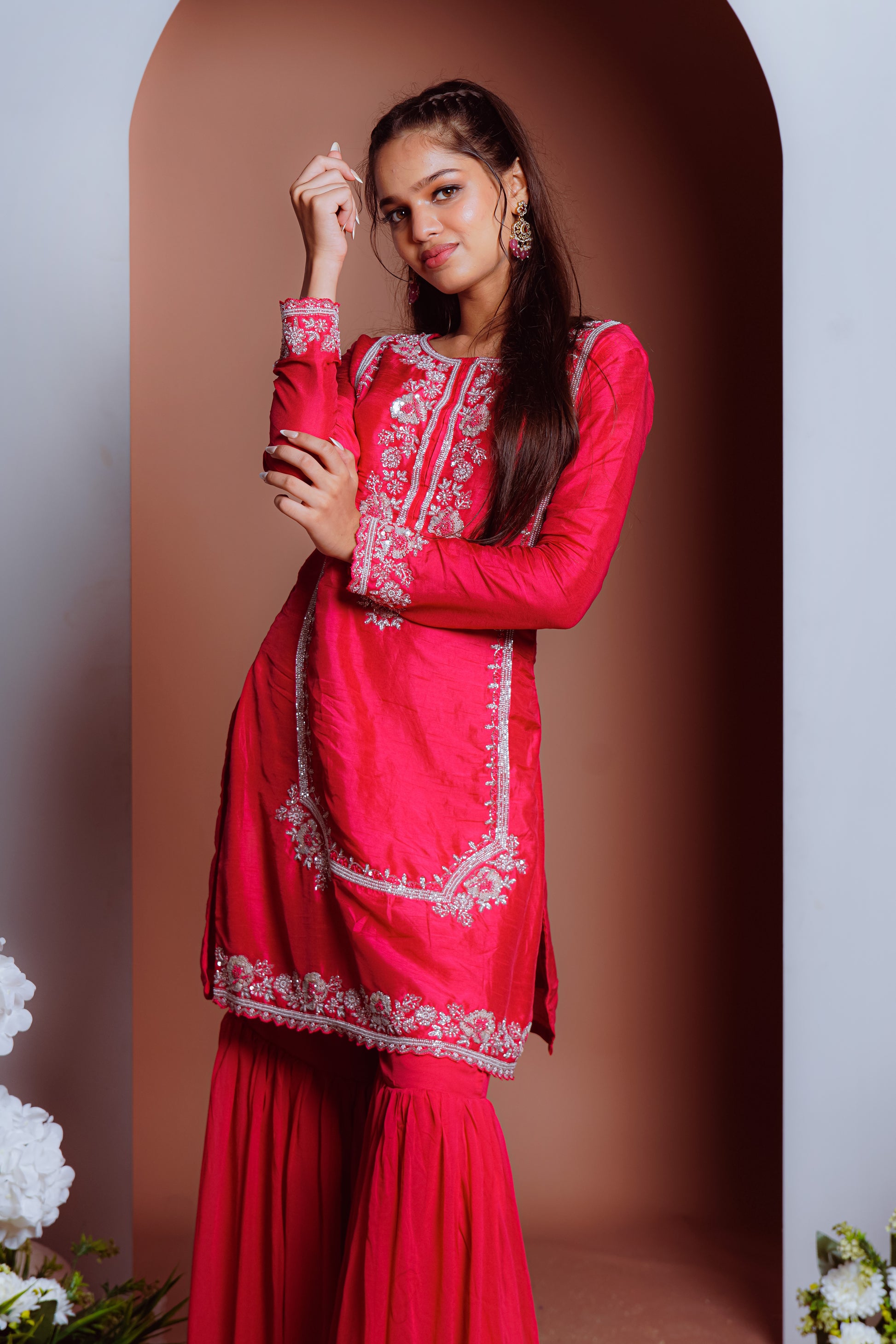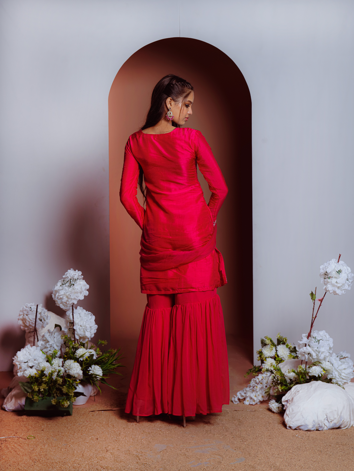 Add some flair to your wardrobe with our Radiant Red Heavy Zardosi Worked Sharara and Kurta set. Perfect for any occasion, this set features intricate zardosi embroidery and comes with a beautiful lace dupatta. Show off your unique style in this one-of-a-kind outfit.