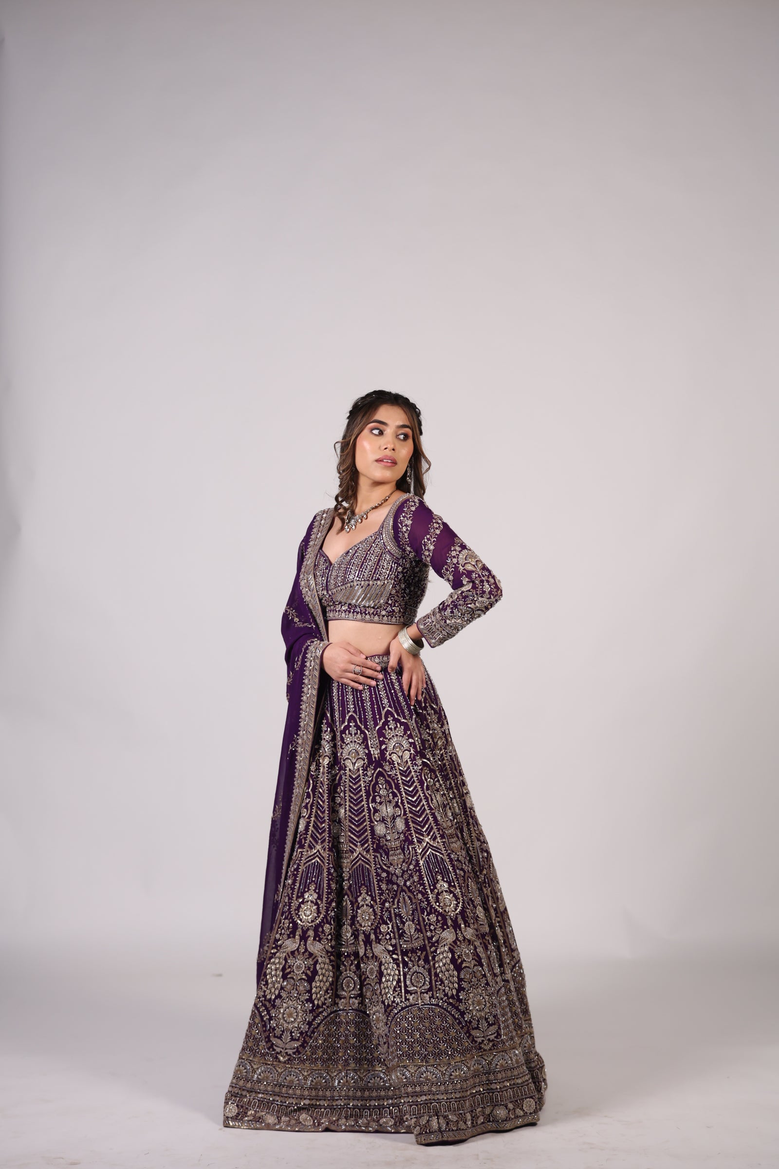 This regal deep purple lehenga choli is a celebration of traditional Indian craftsmanship with a contemporary bridal sensibility. Crafted in a rich amethyst-toned fabric, the ensemble is adorned with intricate silver zari, sequin, and thread embroidery that lends depth, texture, and grandeur to the look.