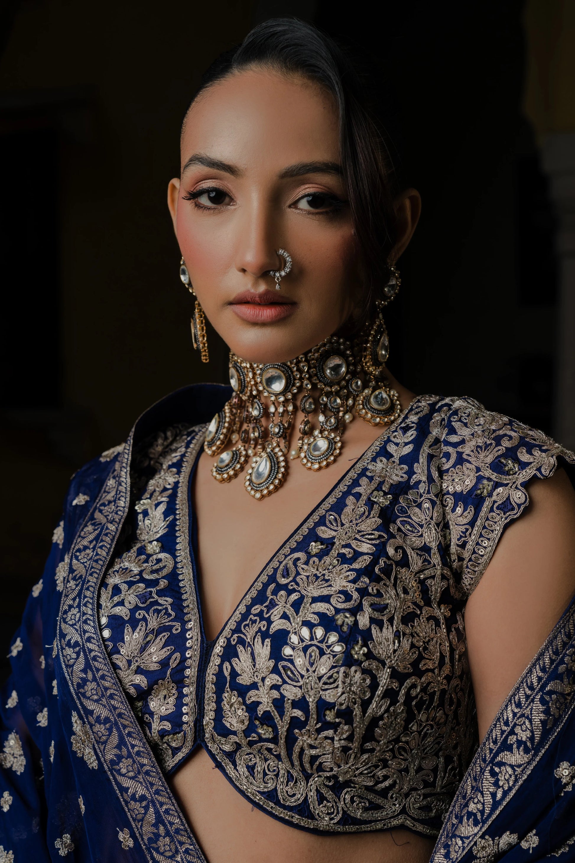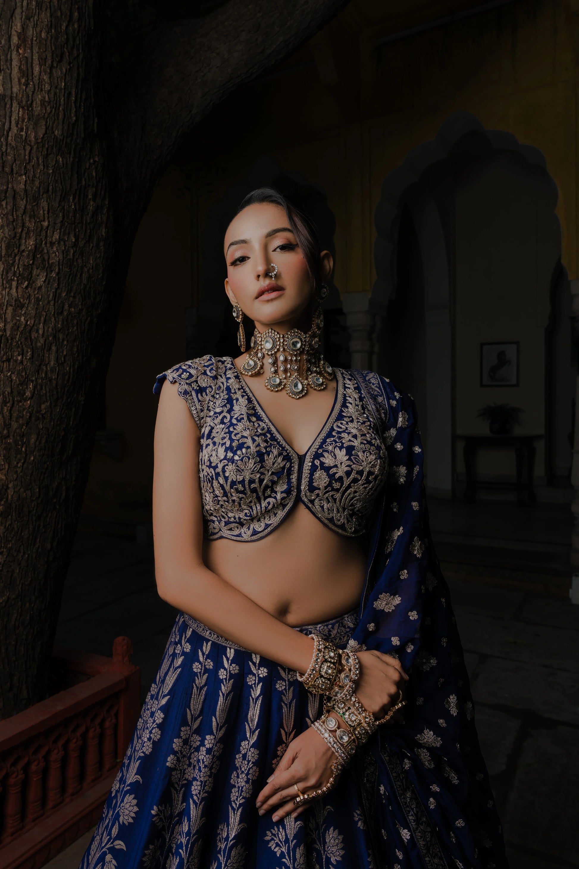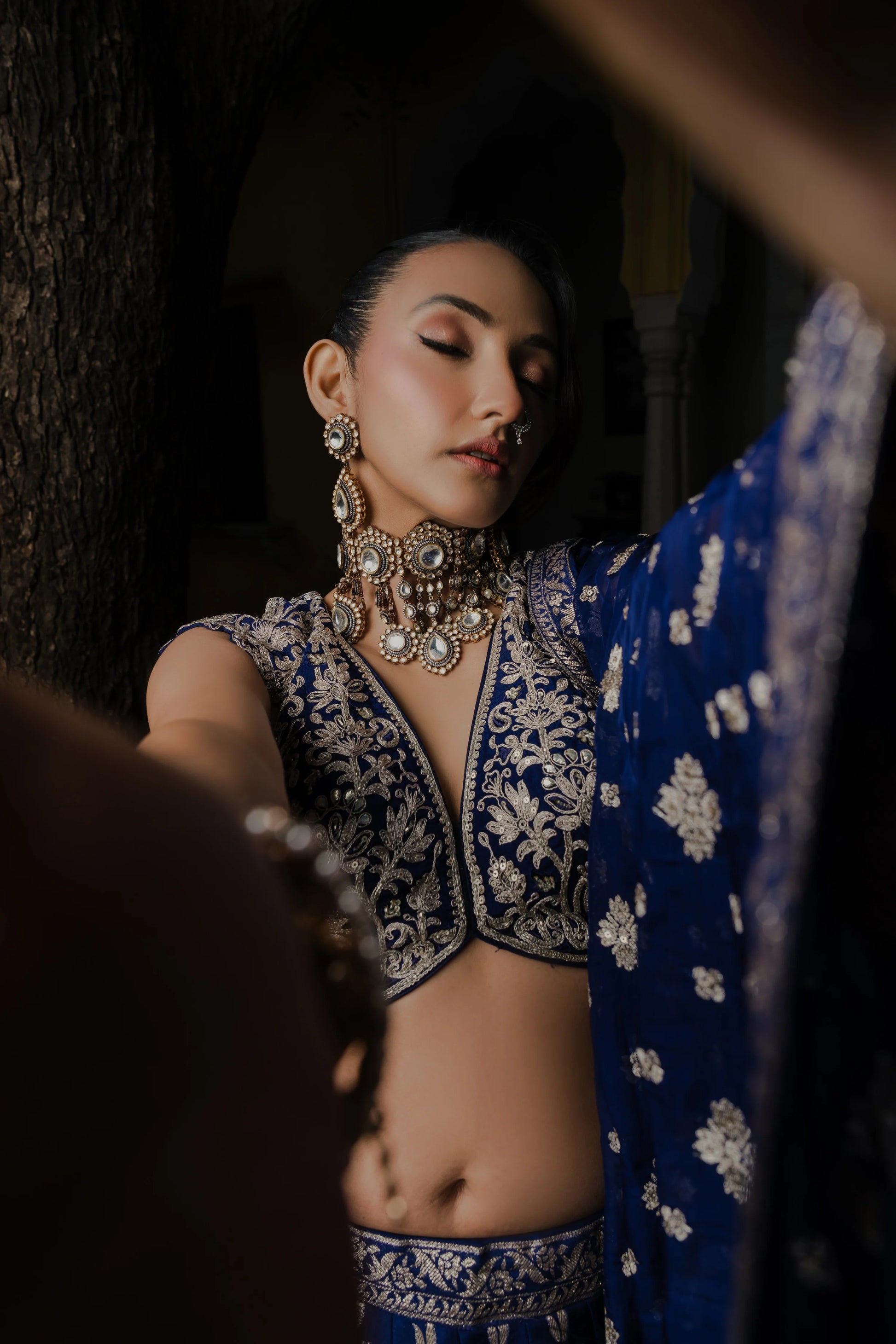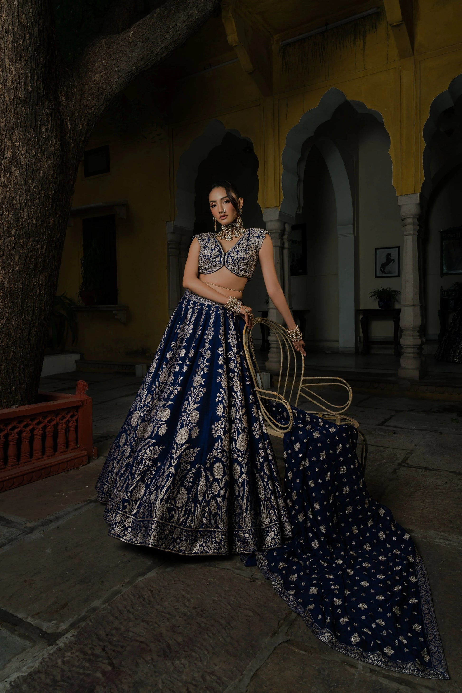 Royal Blue Silk Lehenga Set with Silver Zari Embroidery