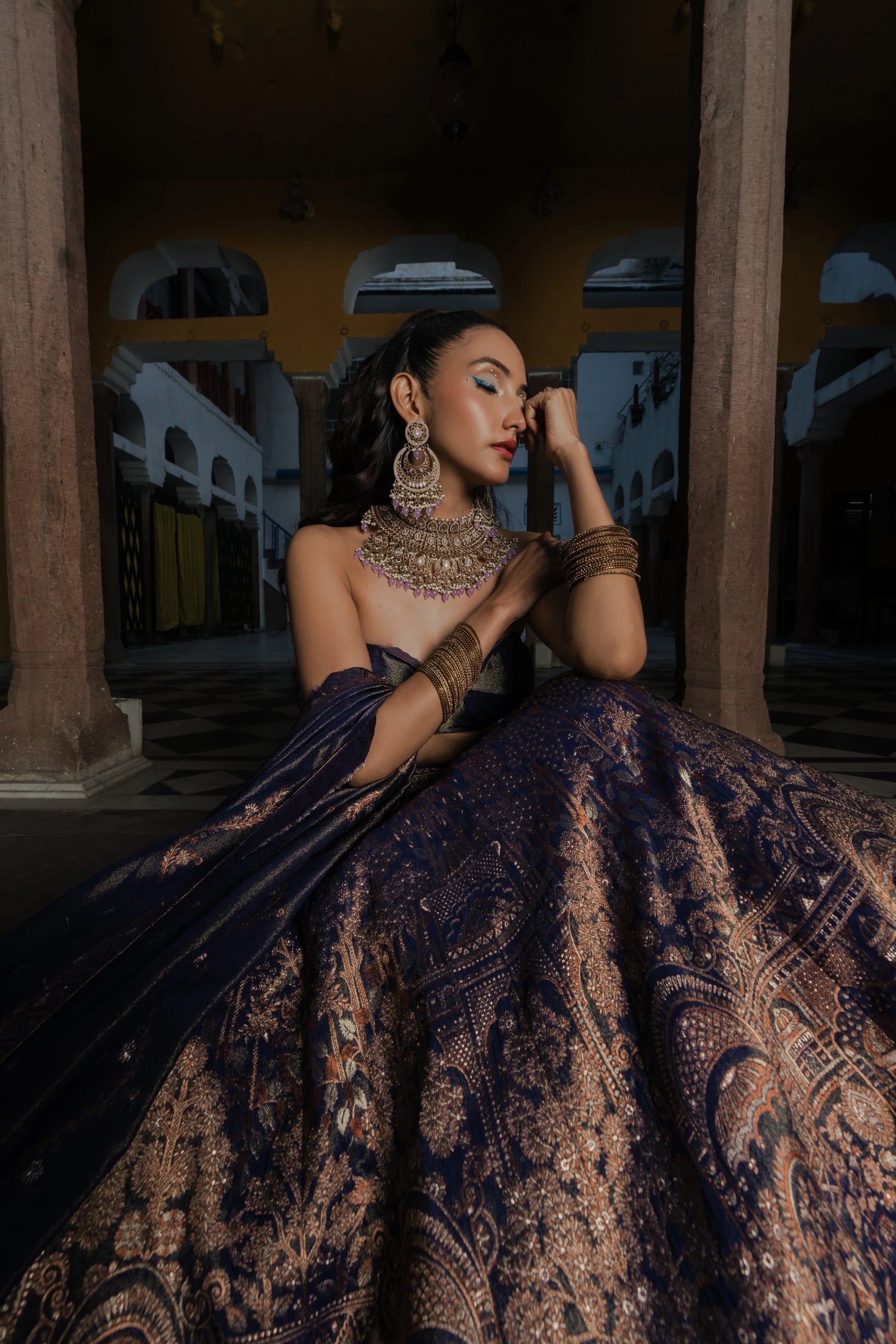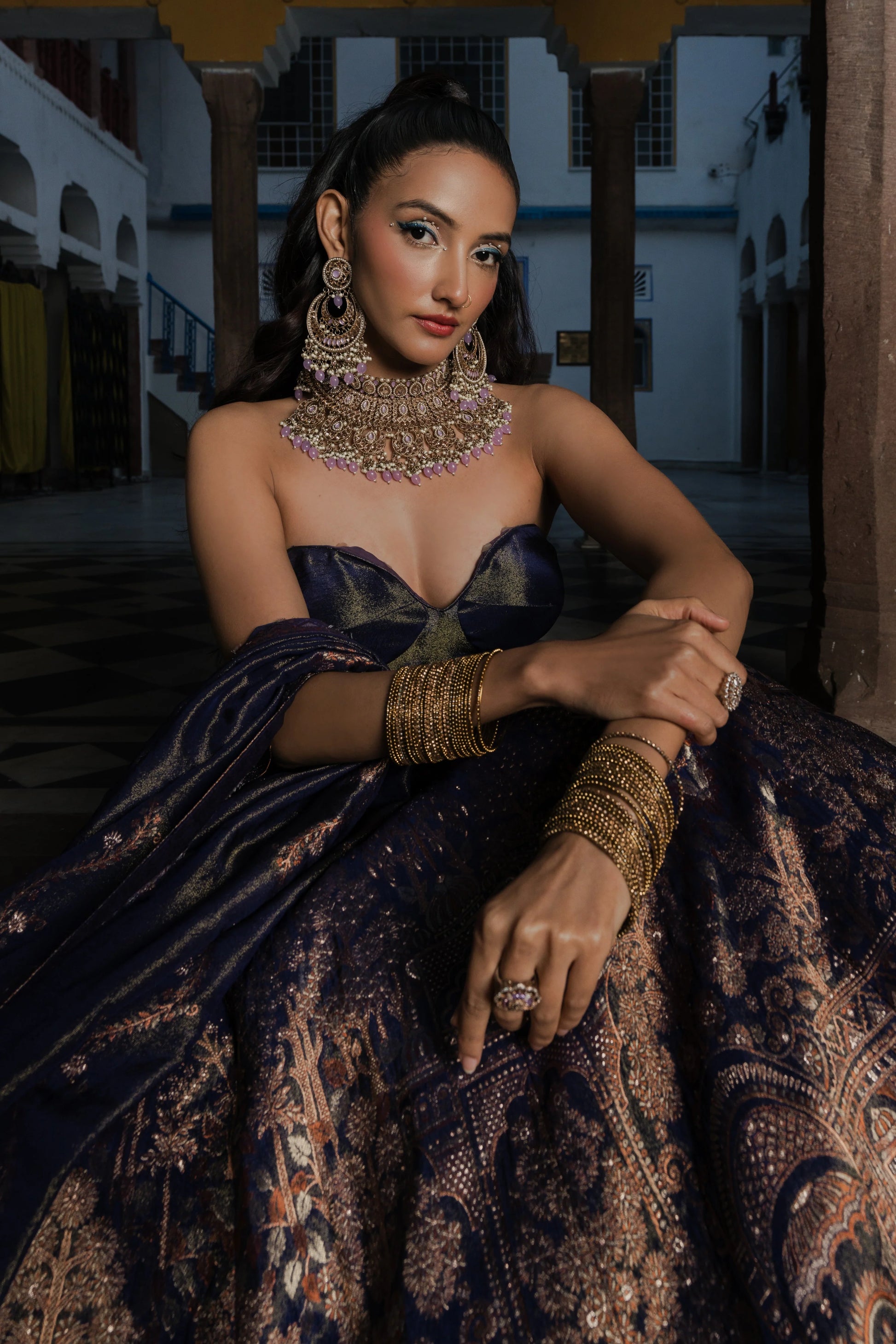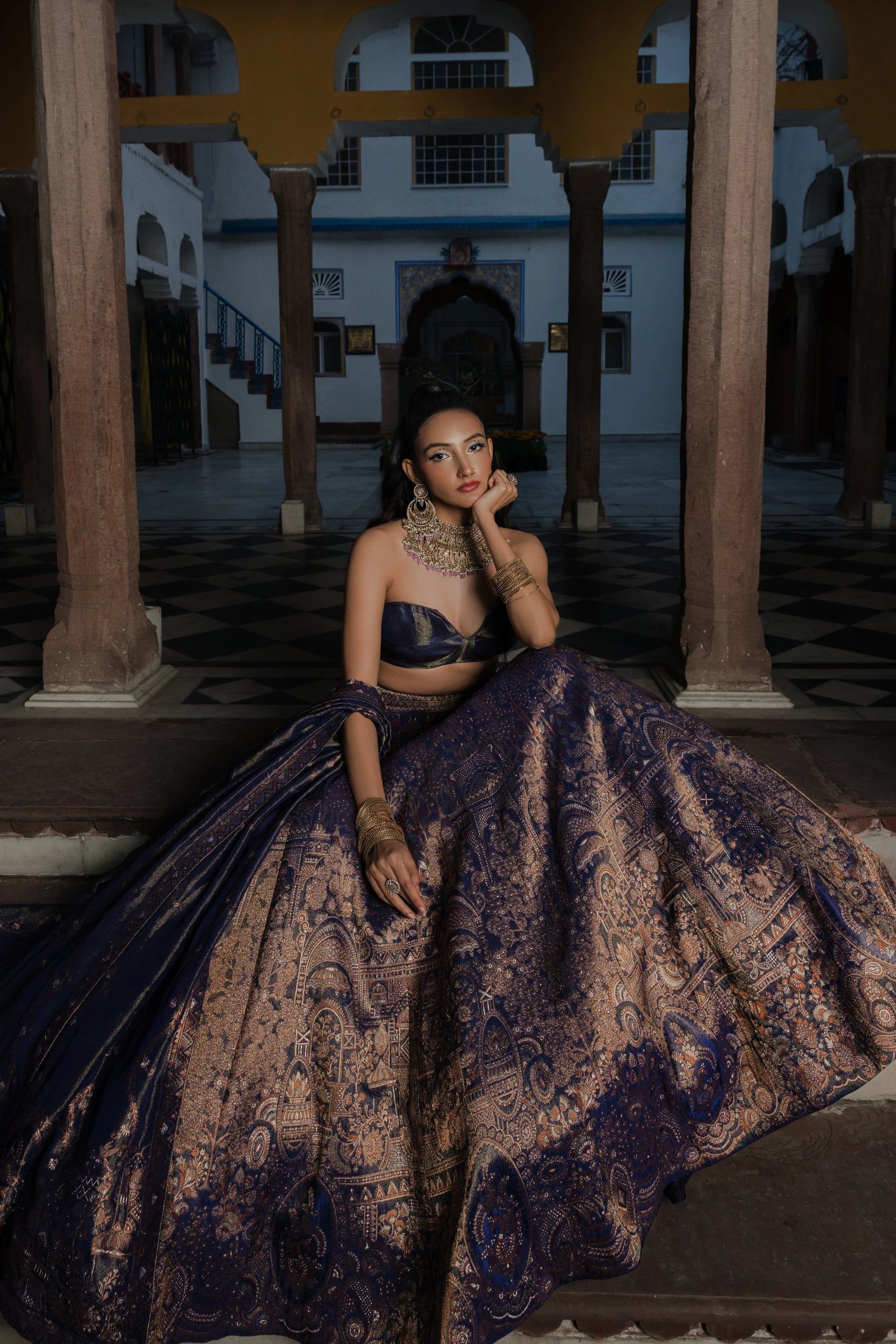 The strapless blouse, tailored in matching silk with a sweetheart neckline, adds a touch of modernity to this traditional creation, making it perfect for the contemporary muse. Completing the set is a coordinating Banarasi dupatta in the same majestic hue, embellished with ornate gold threadwork that mirrors the lehenga’s intricacy.