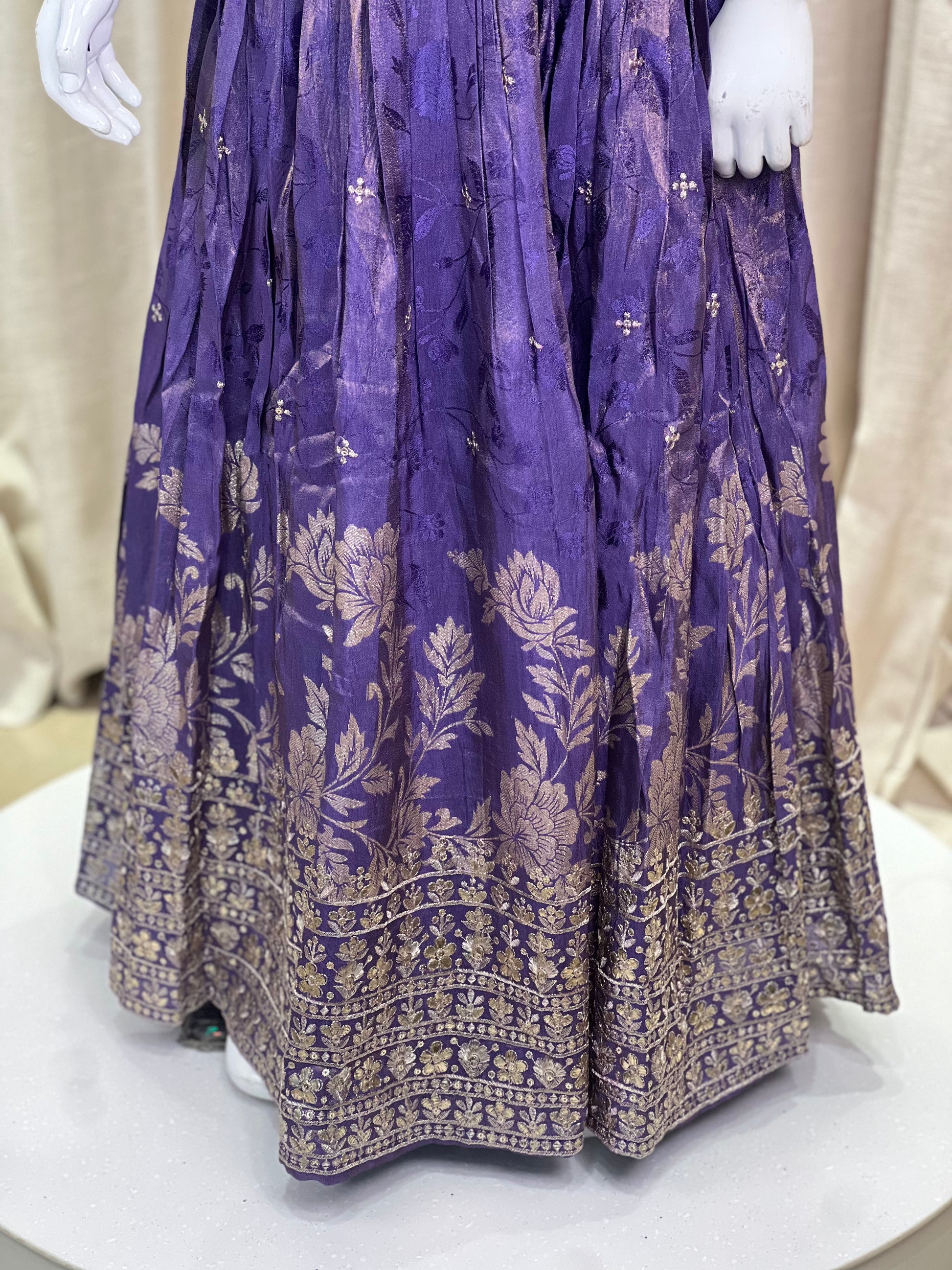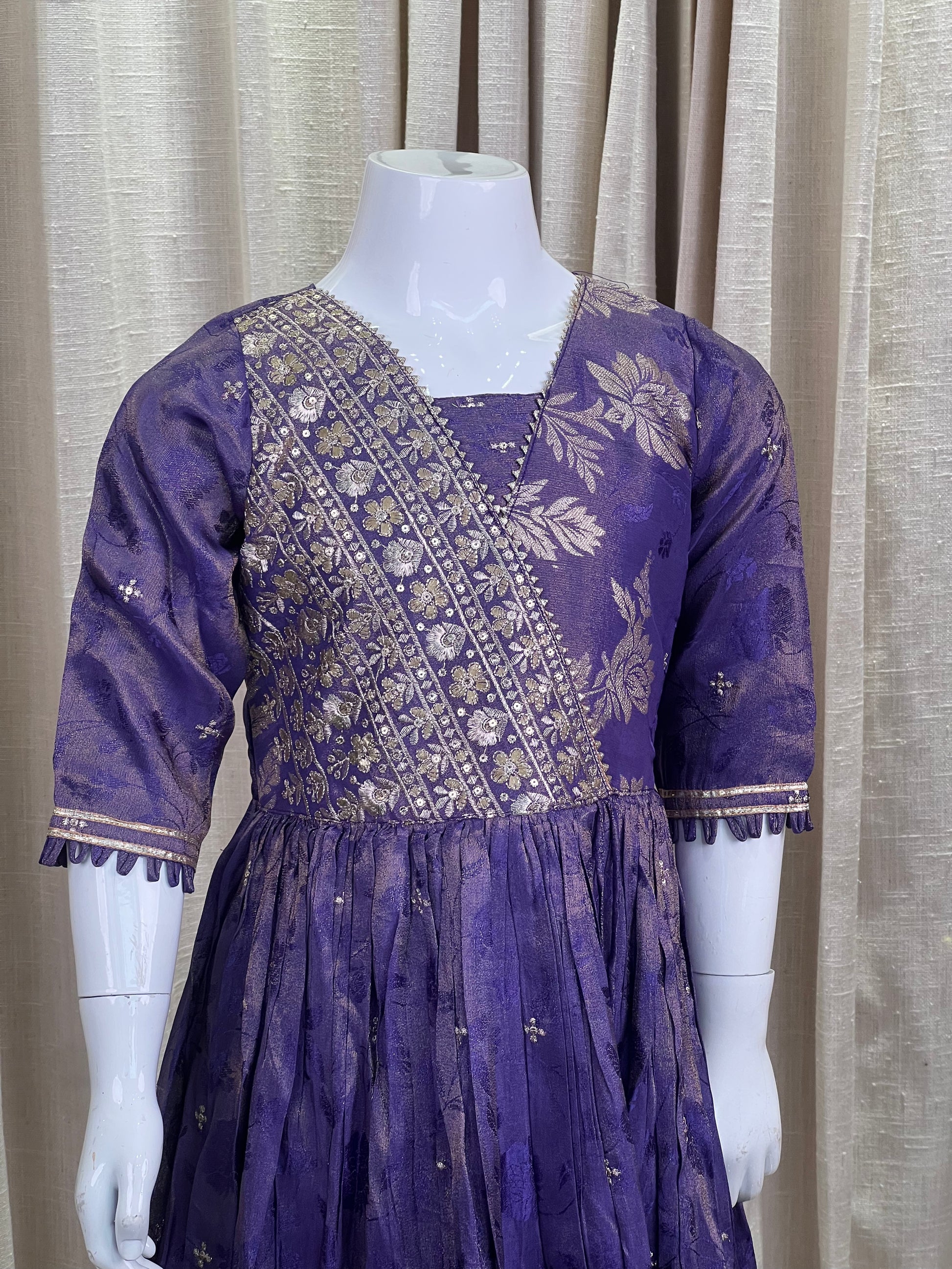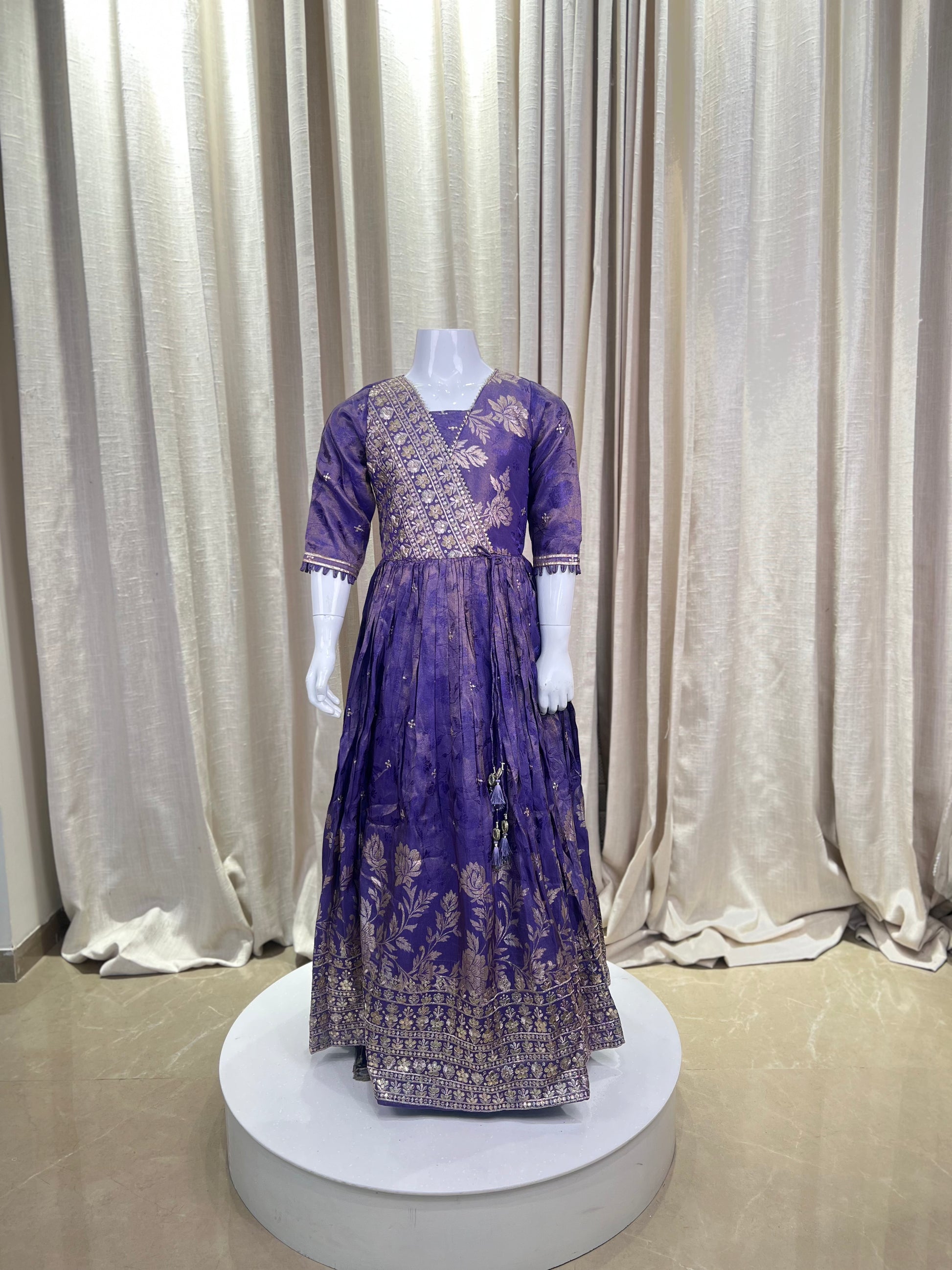 Bring home a regal ethnic charm with this exquisite royal purple Anarkali gown for girls. Adorned with intricate golden brocade motifs and fine embroidery on the bodice, this outfit features a full-flared skirt and 3/4th sleeves with elegant tassel details. Crafted from rich silk-blend fabric, it’s perfect for festive occasions, weddings, and cultural events where grace meets tradition.