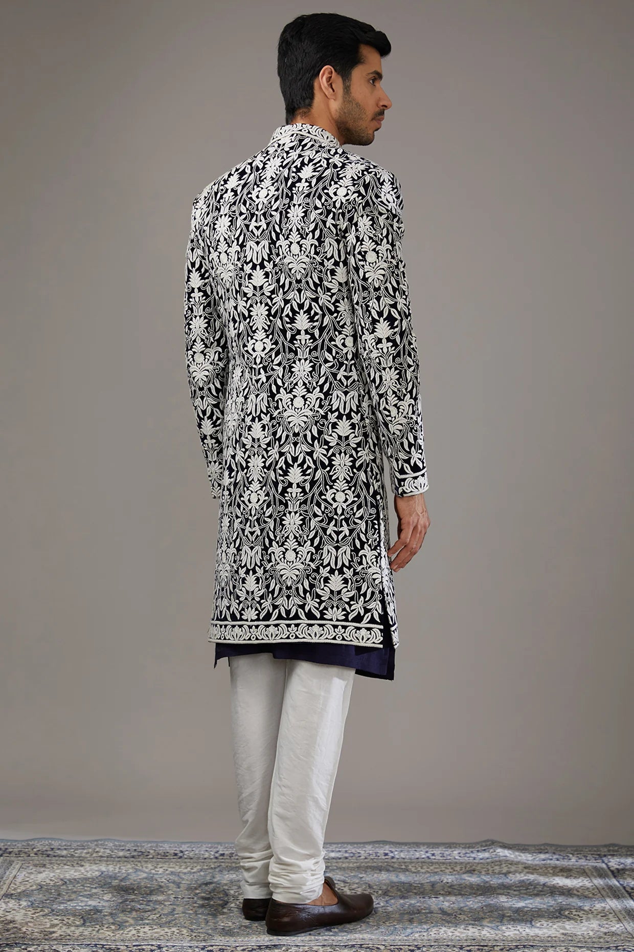 Unleash your royal elegance with our Royal Silk Blue Velvet Indo-Western Set! The luxurious royal silk fabric and intricate velvet detailing make this set perfect for any special occasion. Comfort and style come together to create a truly regal ensemble. Own the spotlight with this exquisite set.