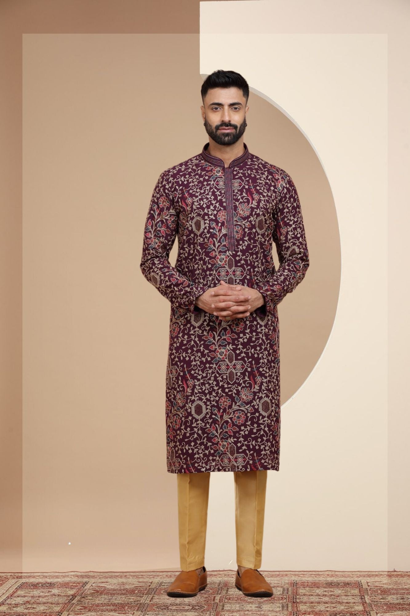 Unleash your bold and playful side with our Ruby Wine Printed Kurta Set. Perfect for standing out at any occasion, this set includes a ruby wine colored kurta with a striking print. Make a statement and show off your unique sense of style with this set.
