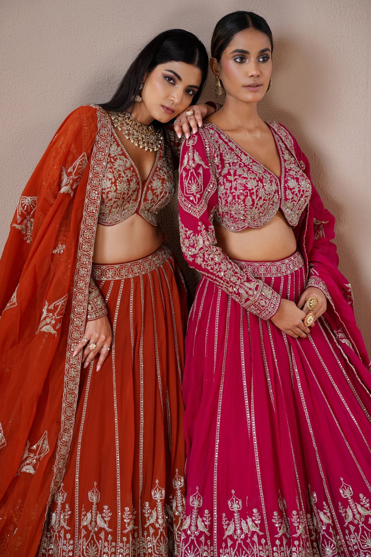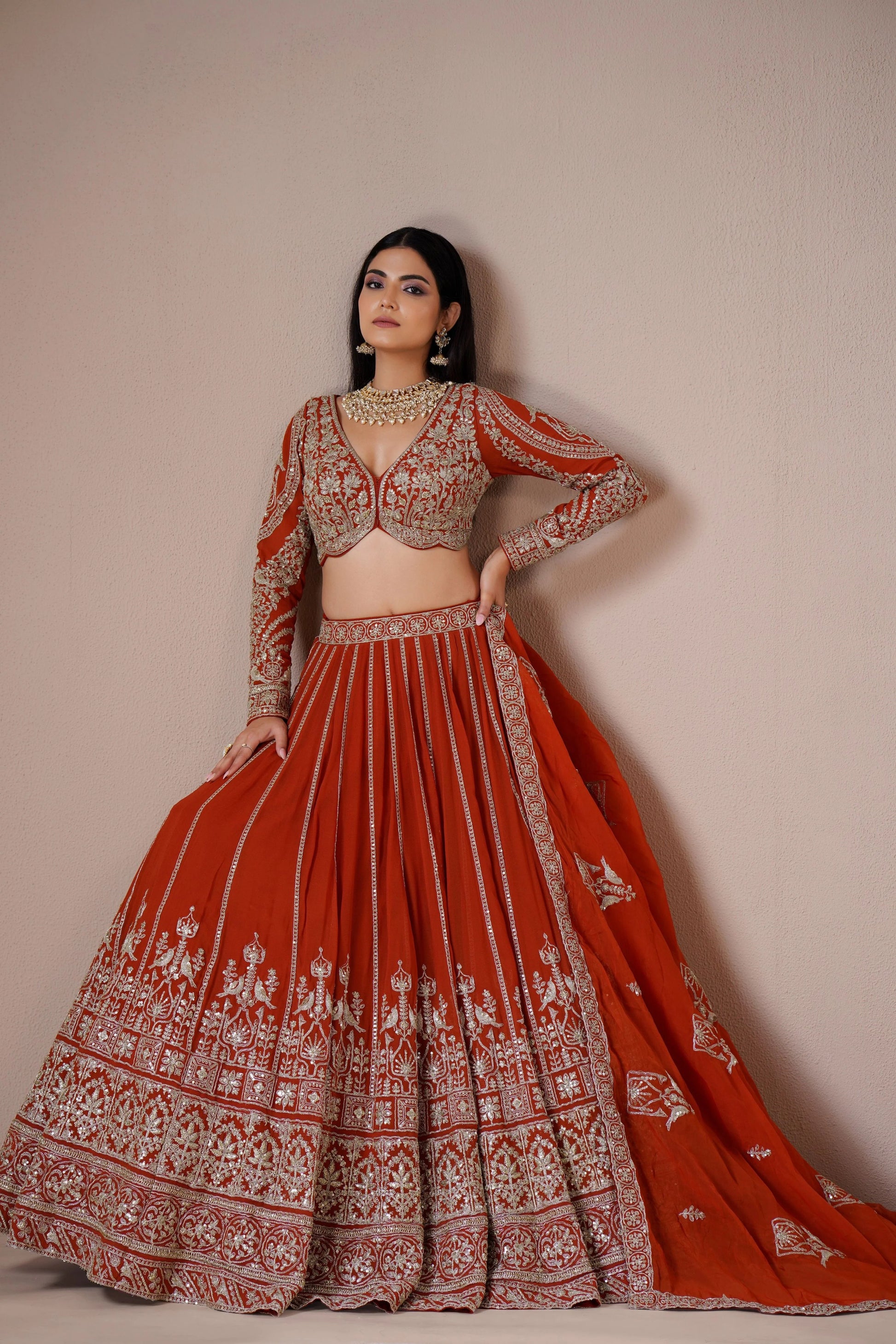 Rust Orange Organza Lehenga with Intricate Zardosi Embroidery