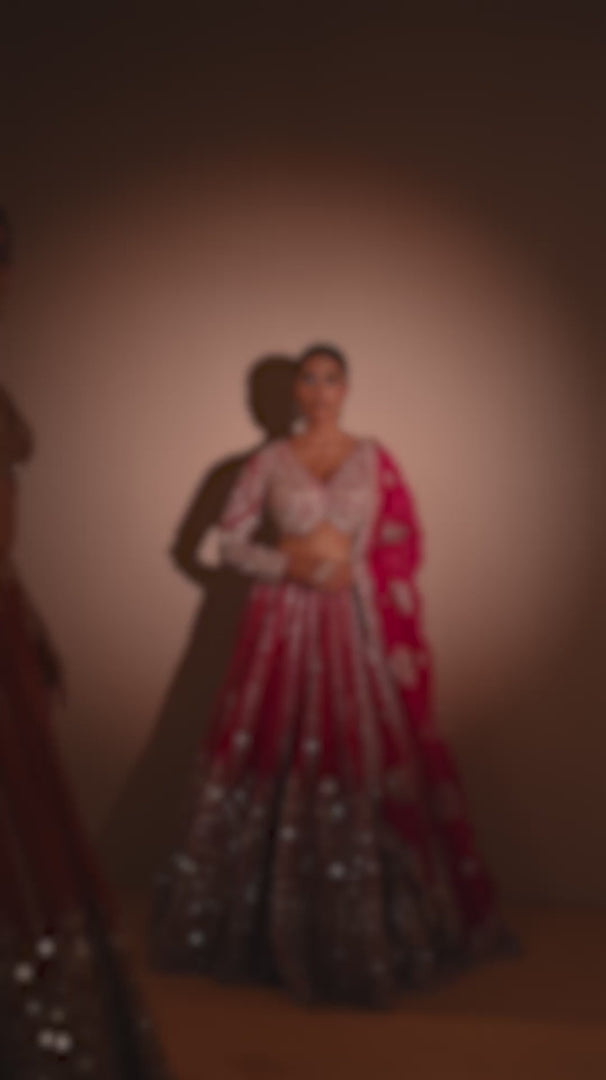 The long-sleeved blouse, tailored in a structured silhouette, showcases heavy thread and sequin detailing with a deep V-neckline, bringing a bold yet sophisticated allure. The lehenga skirt mirrors the embroidery with vertical panel work and a grand embroidered hem, creating a stunning visual rhythm with every twirl.
