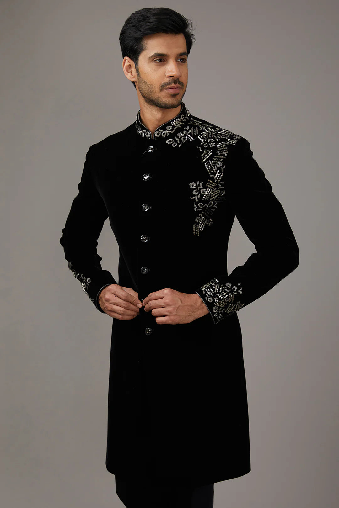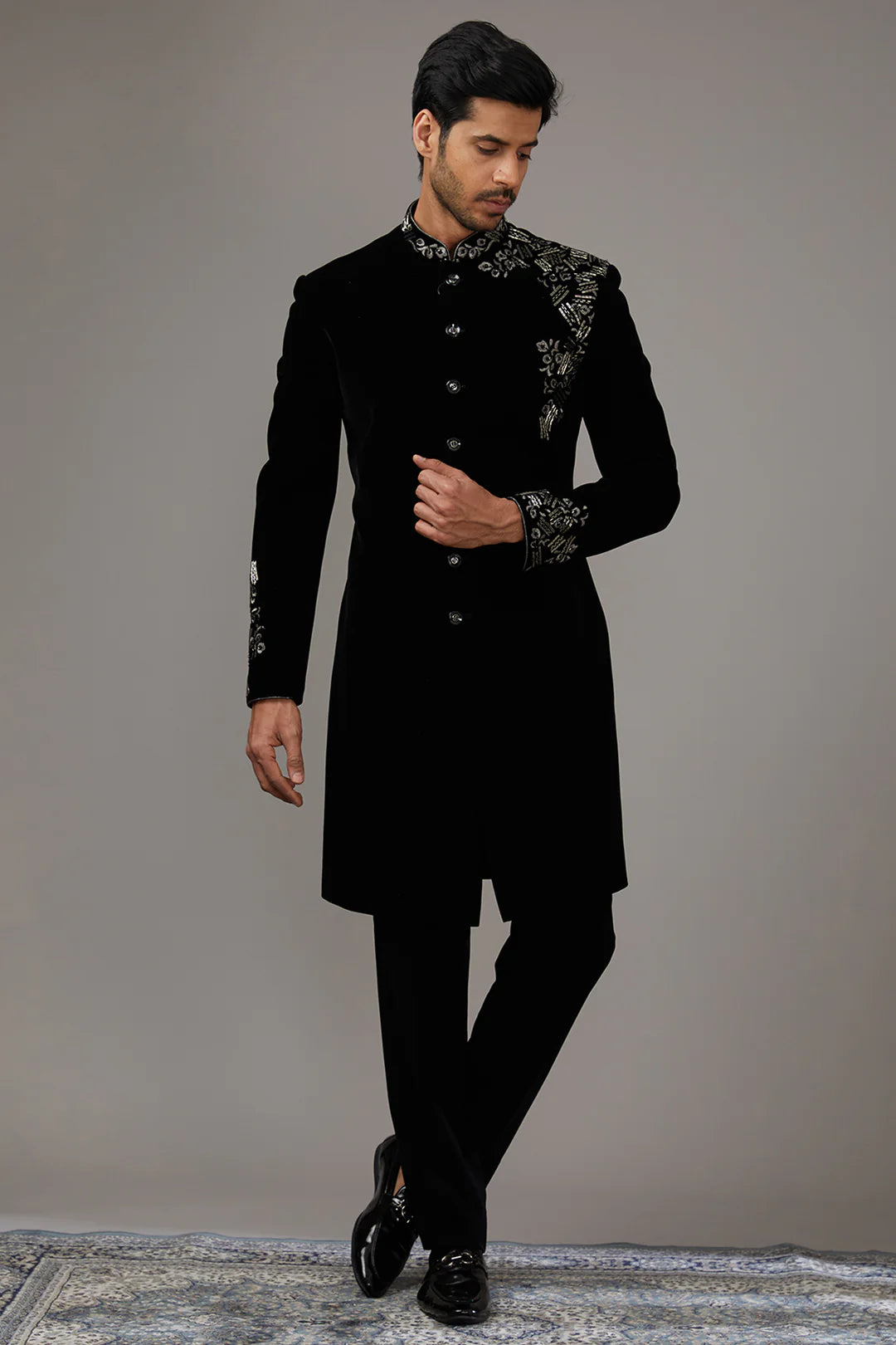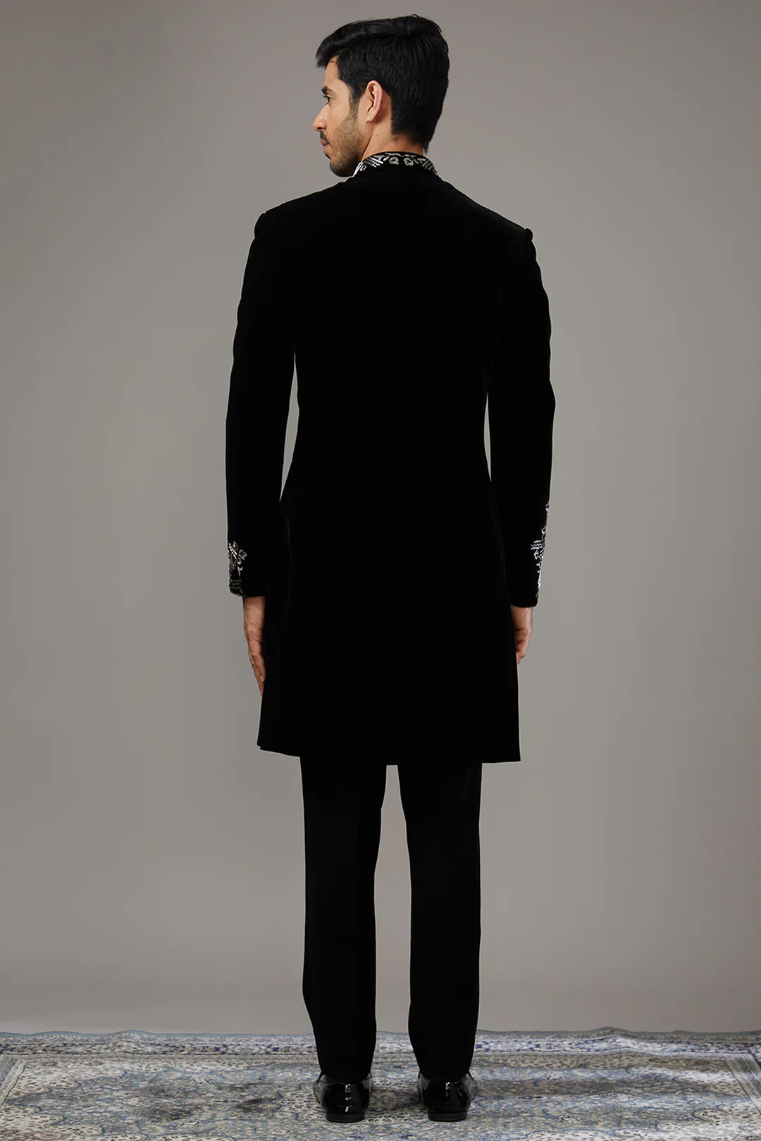 Elevate your style with our Silver Noir Velvet Indo-Western Set. Crafted with luxurious silver velvet, this set exudes elegance and sophistication. Perfect for any formal occasion, it will make you stand out in the crowd. Upgrade your wardrobe with this timeless piece and make a statement wherever you go.
