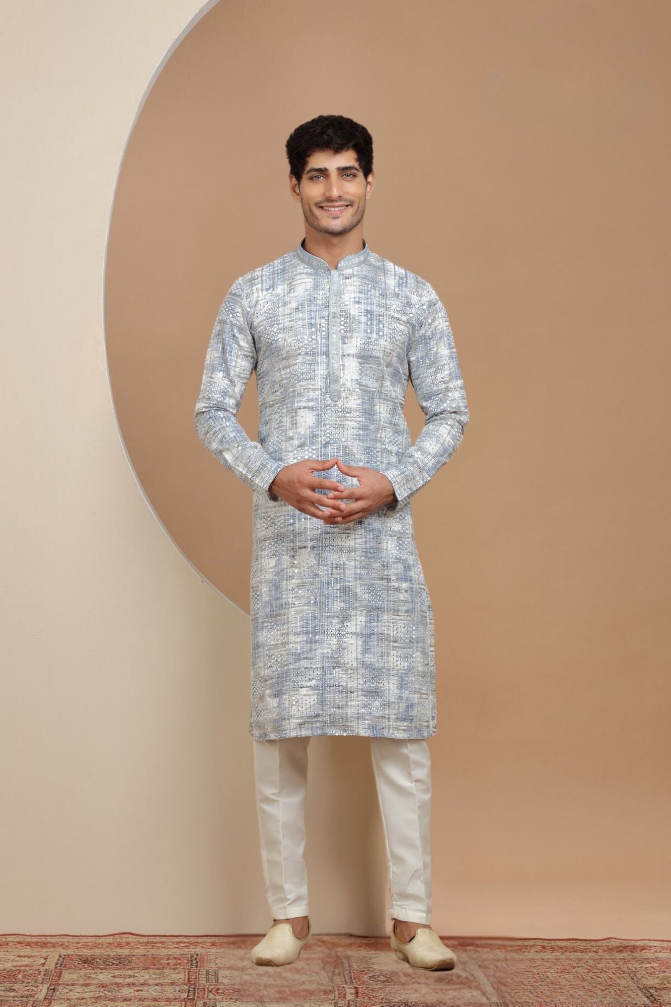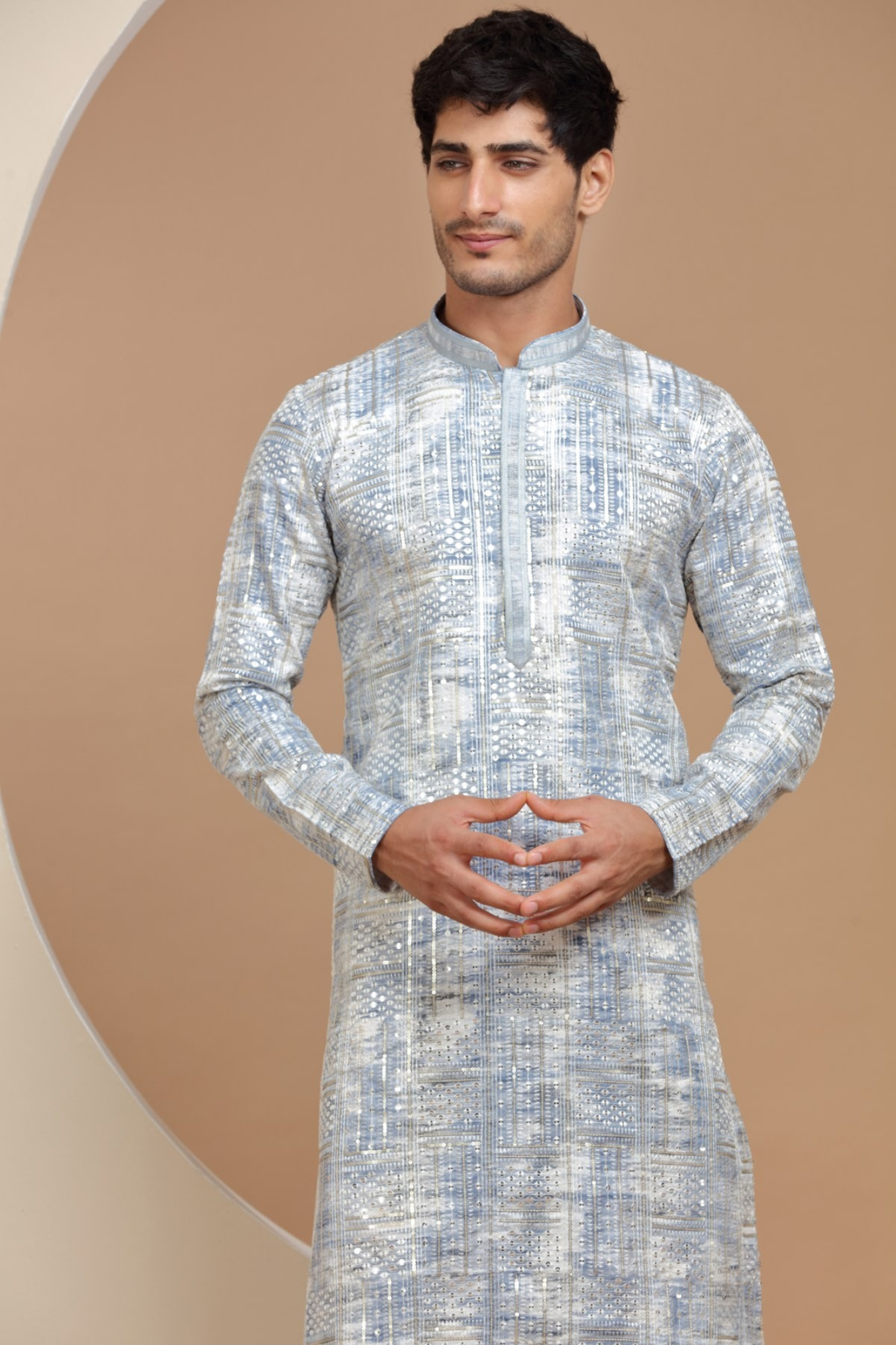 This Kurta is ready to add some sparkle to your wardrobe! With sky blue sequins work (because everything is better with sequins), this kurta will make you feel like a star. Perfect for any occasion. Shine bright like the sky in this beautiful kurta.