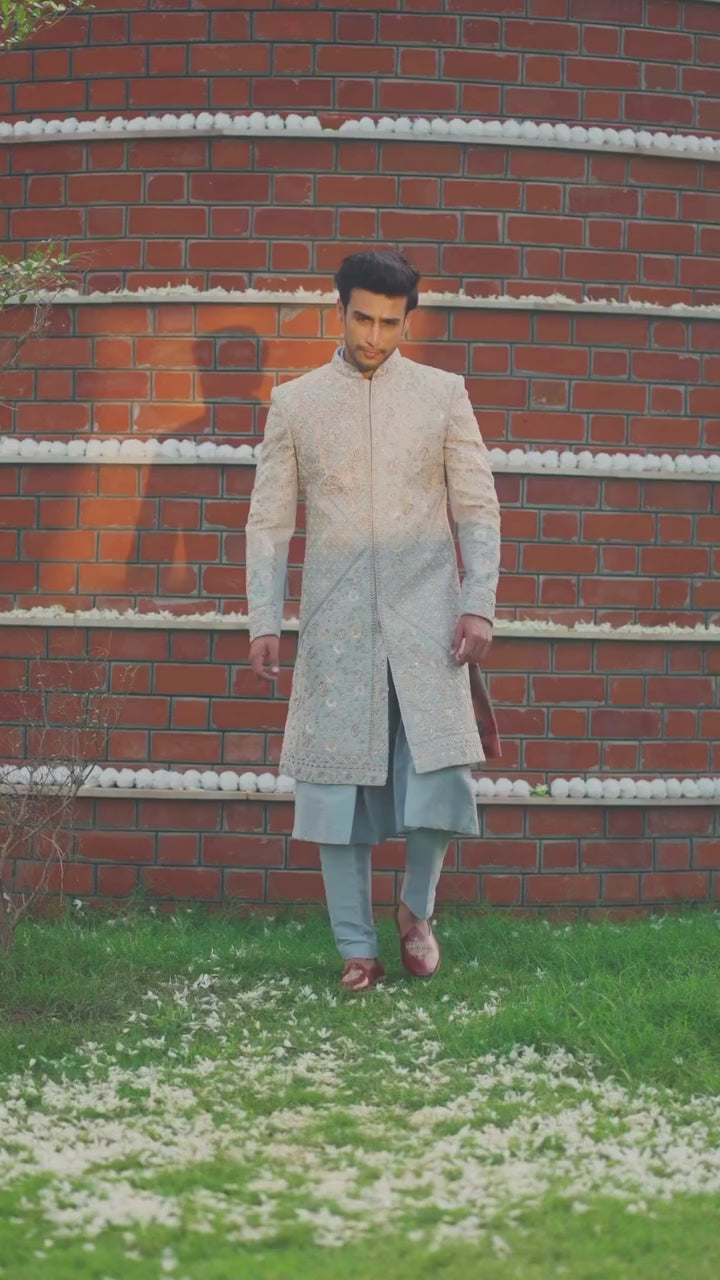 Experience the perfect blend of elegance and cultural charm with our sophisticated grey sherwani. Adorned with intricate Indian embroidery, this sherwani is sure to make a statement at any occasion. Elevate your style and embrace your heritage with this stunning piece.