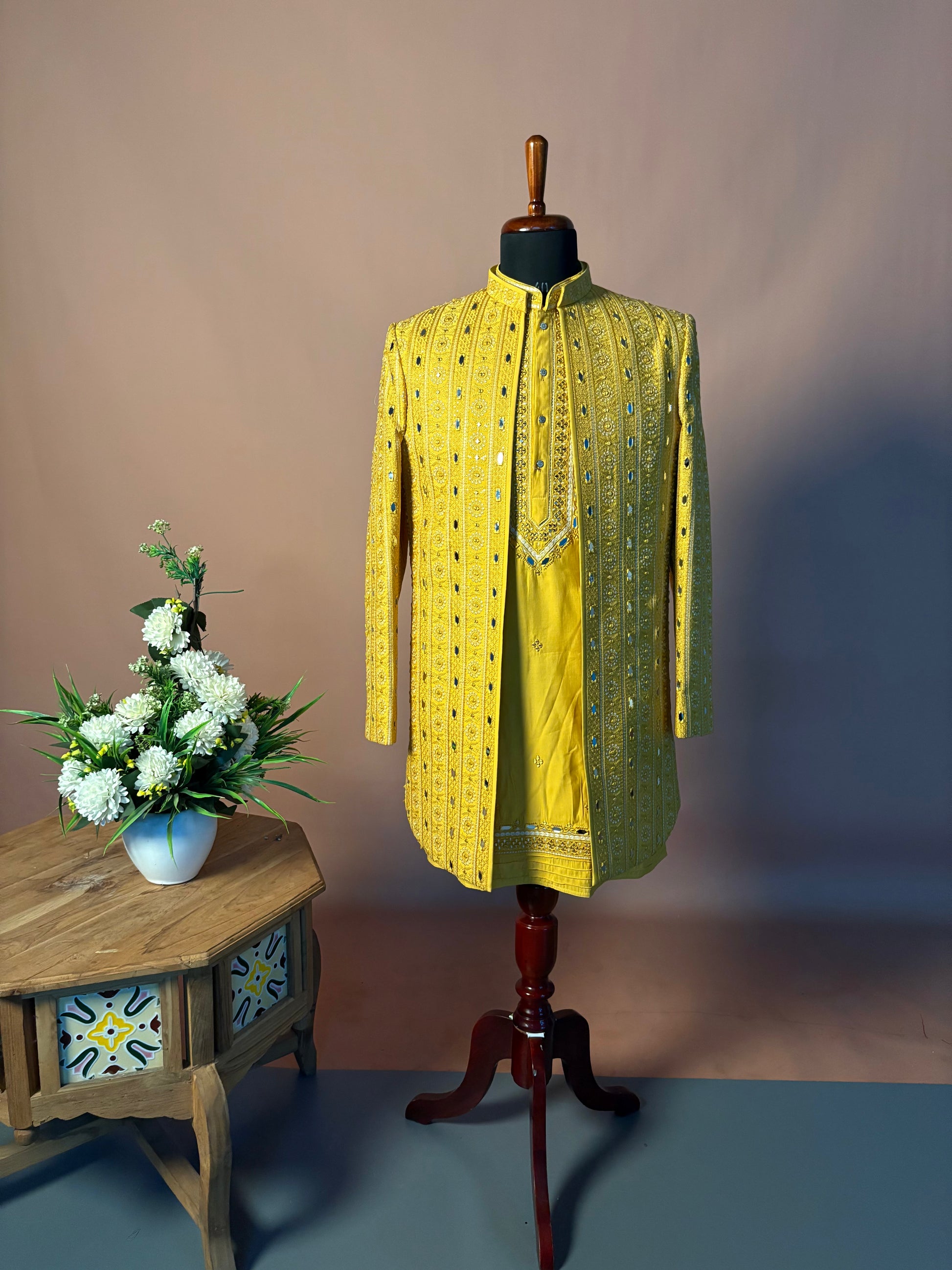 Make a bold style statement with this vibrant yellow kurta set featuring a heavily embellished jacket adorned with intricate mirror work and thread embroidery. The inner kurta has a classic placket design with subtle embroidery, while the outer jacket elevates the entire look with its regal detailing. Perfect for haldi, mehndi, or festive celebrations, this outfit exudes a joyful and celebratory vibe for the modern groom or wedding guest.