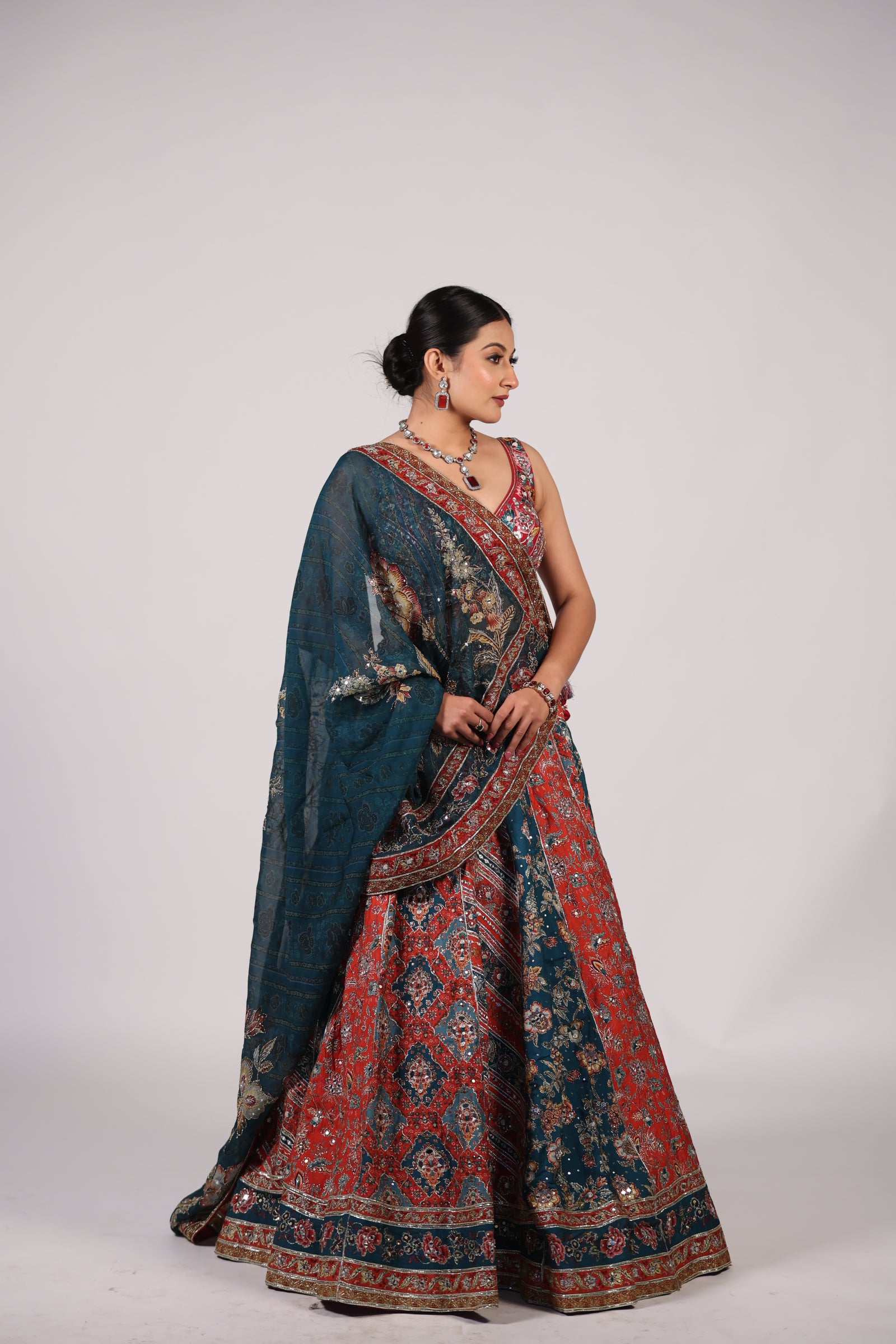 Crafted for elevated festive moments, this teal blue and rust red lehenga choli brings together rich colours and detailed craftsmanship in a refined silhouette. The lehenga features all-over floral motifs, intricately worked with zari, resham, and fine sequin embroidery, creating a luxurious yet wearable appeal.