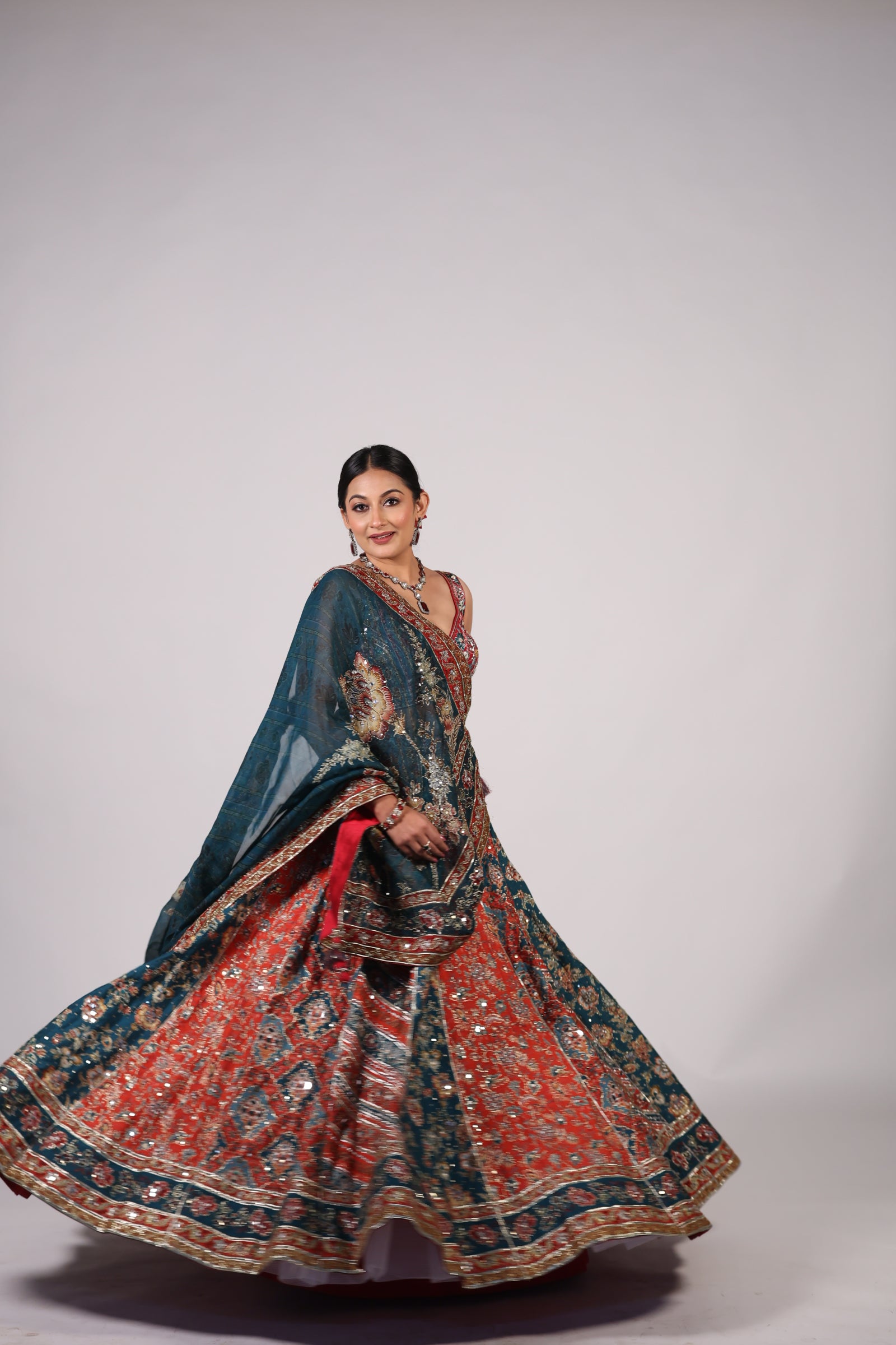 Teal Blue & Rust Red Floral Hand-Embroidered Festive Lehenga Choli