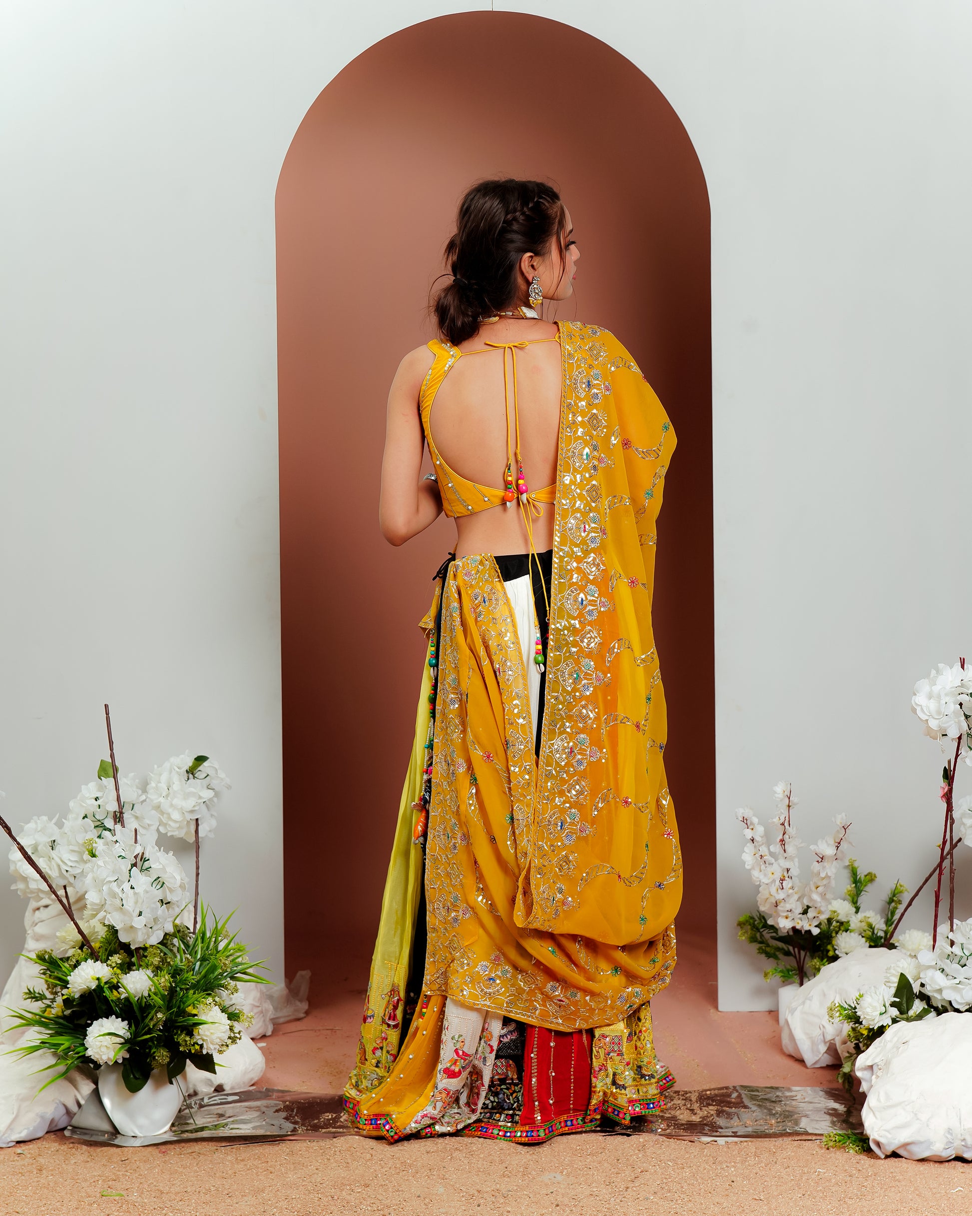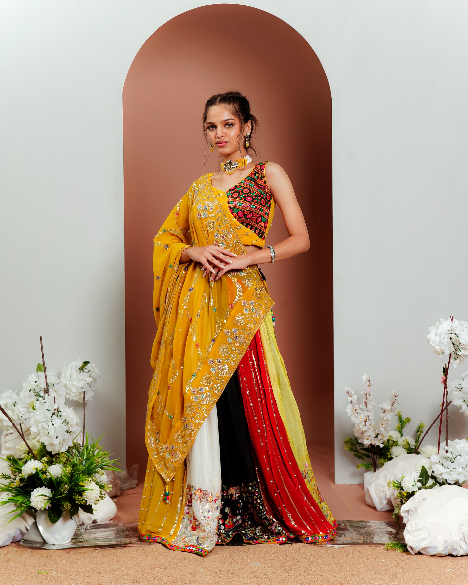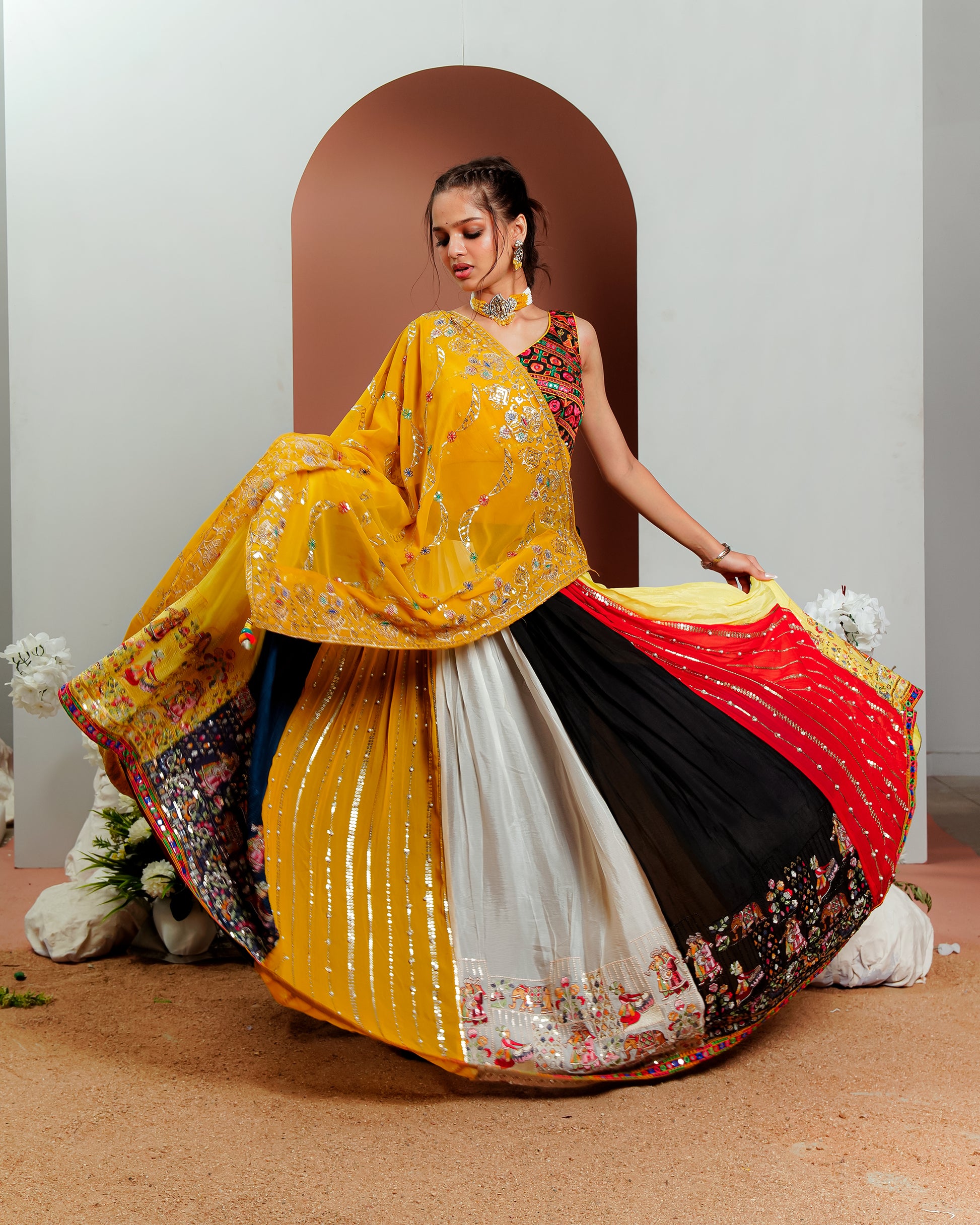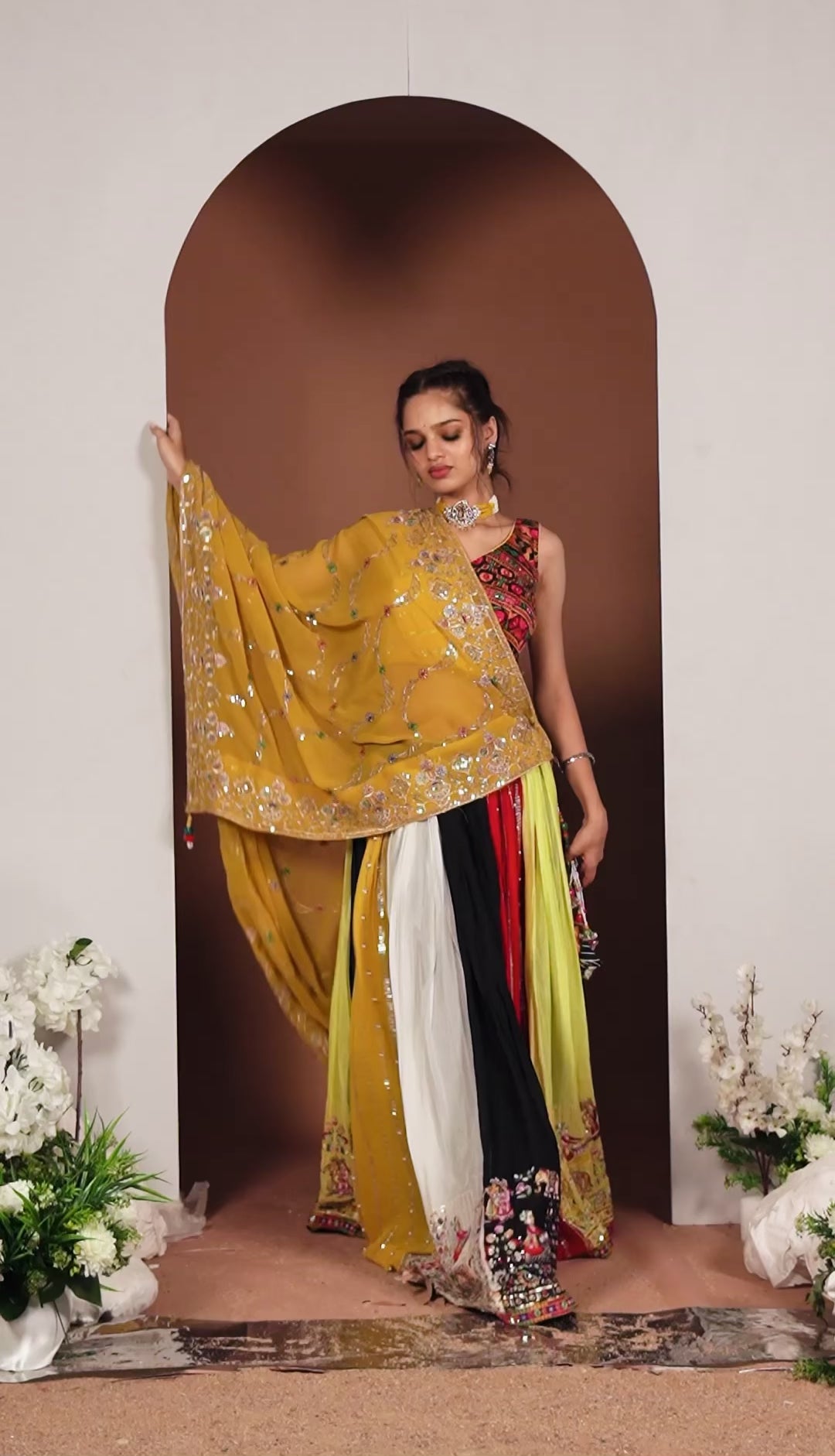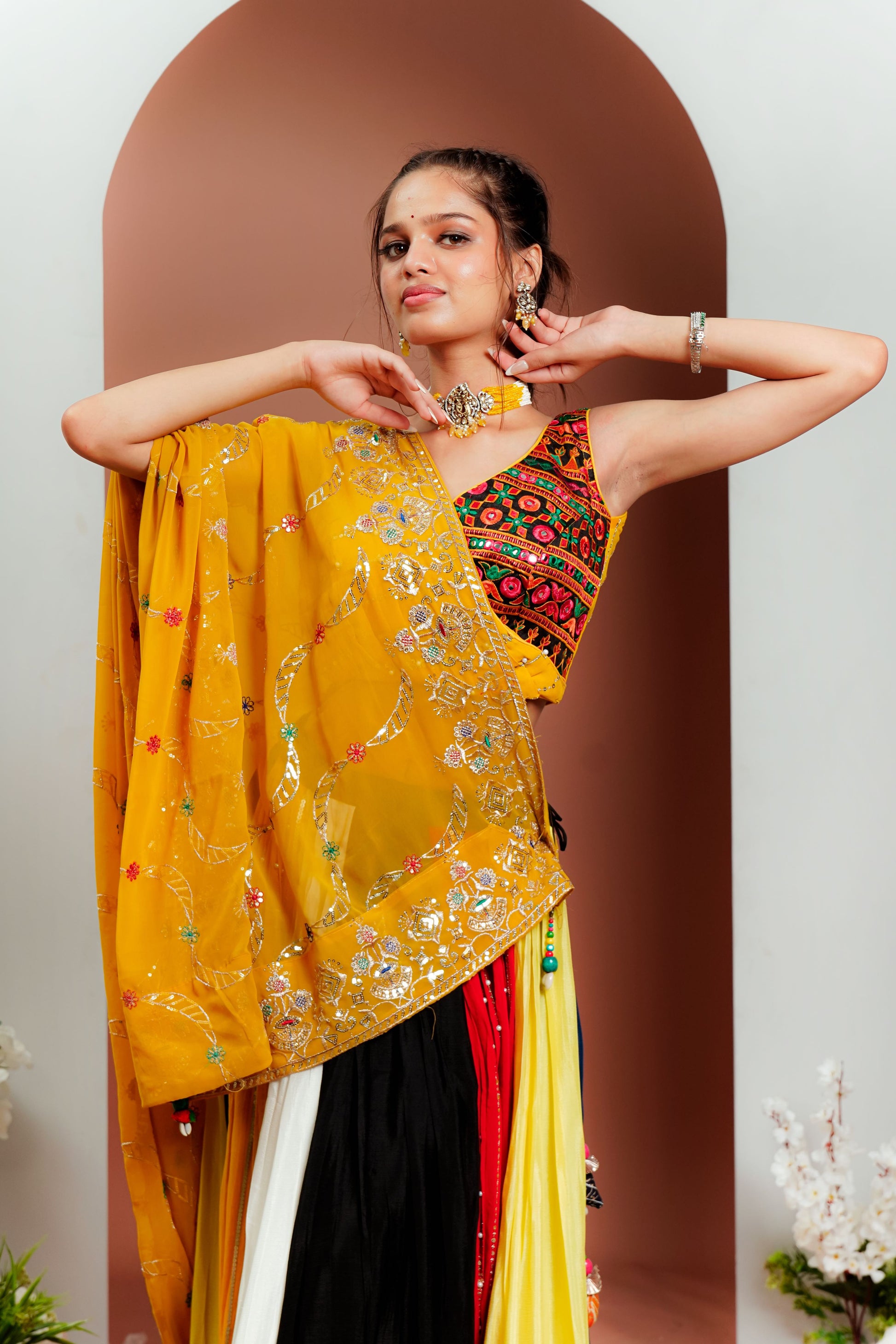 Introducing our stunning multicolour chaniya choli, a perfect blend of tradition and modern flair. This exquisite ensemble features vibrant straps in yellow, black, red, navy blue, and green, creating a playful yet elegant look. The blouse showcases a striking yellow base adorned with intricate Gujarati embroidery in red, black, and green, adding a touch of artistry. The flowing dupatta in a cheerful yellow, embellished with silver accents, complements the outfit beautifully. Ideal for festivals, weddings, or special occasions, this chaniya choli will make you the center of attention, celebrating your unique style with every twirl. Embrace the colors of tradition!