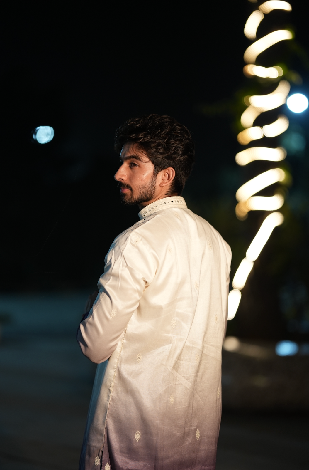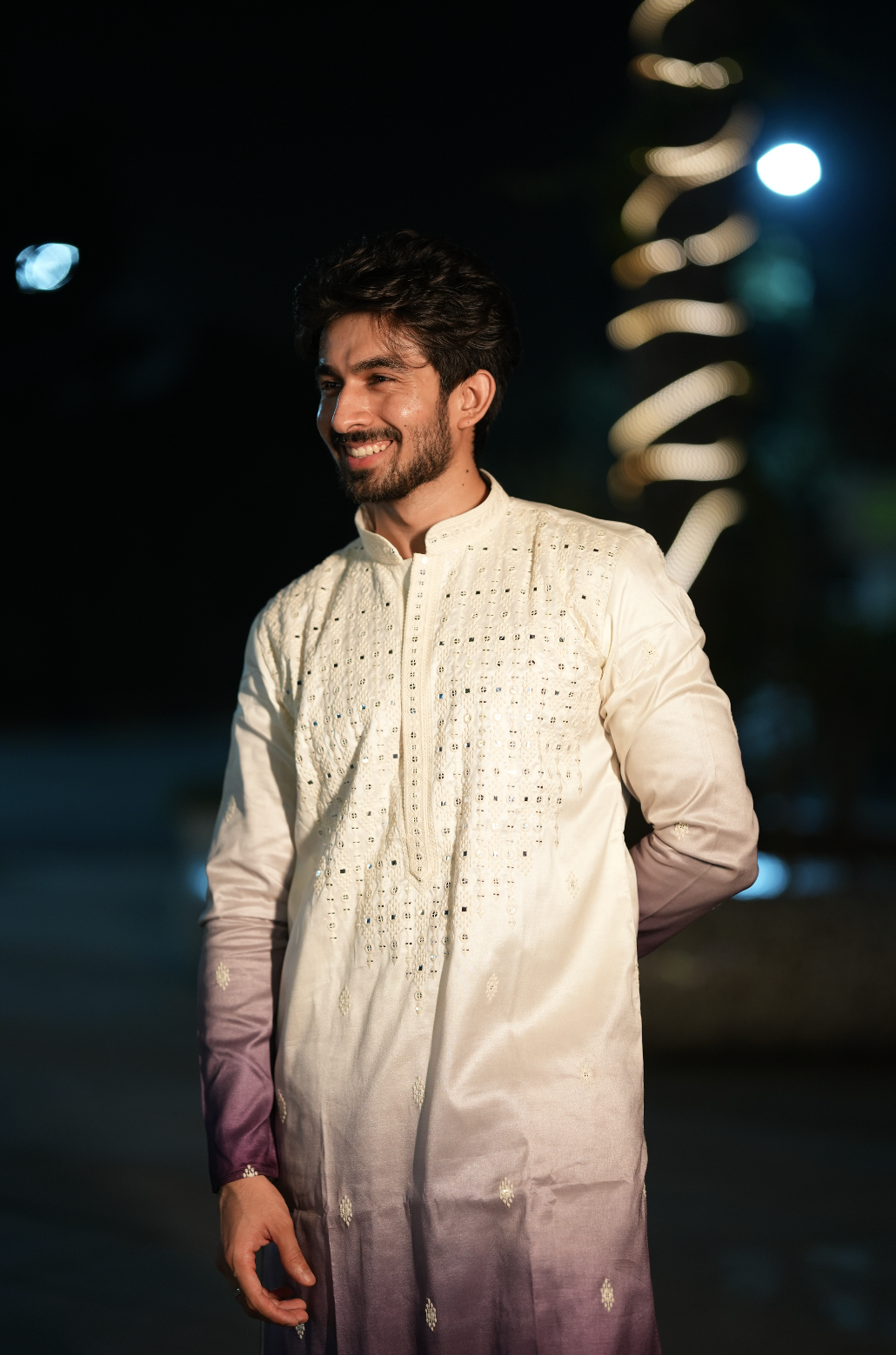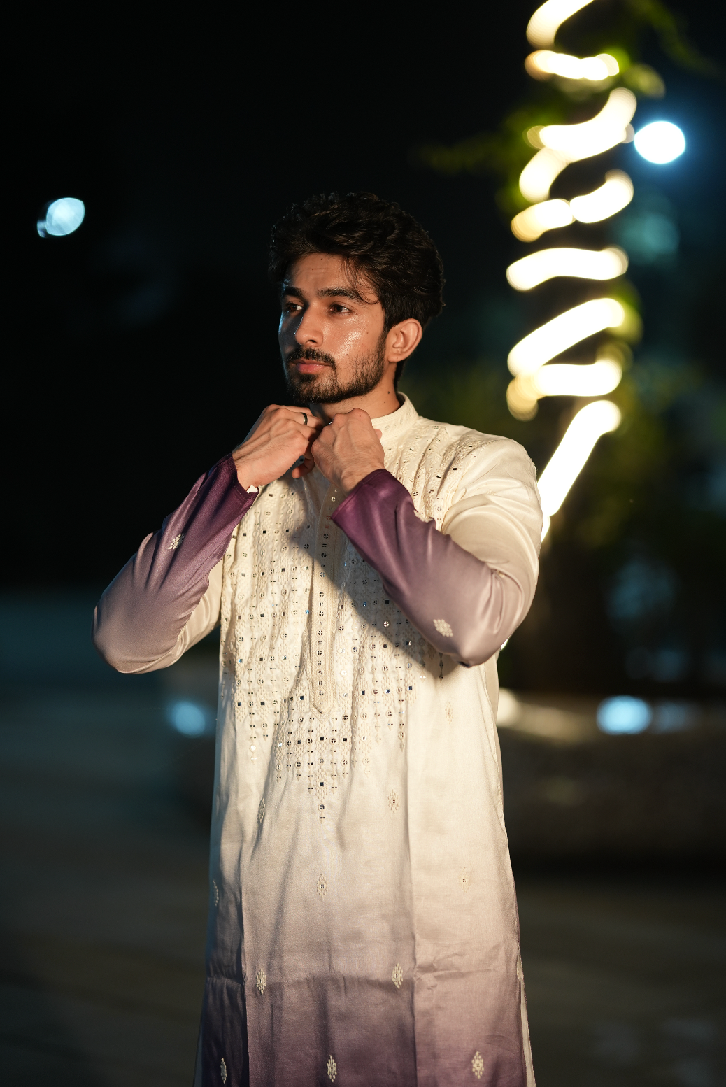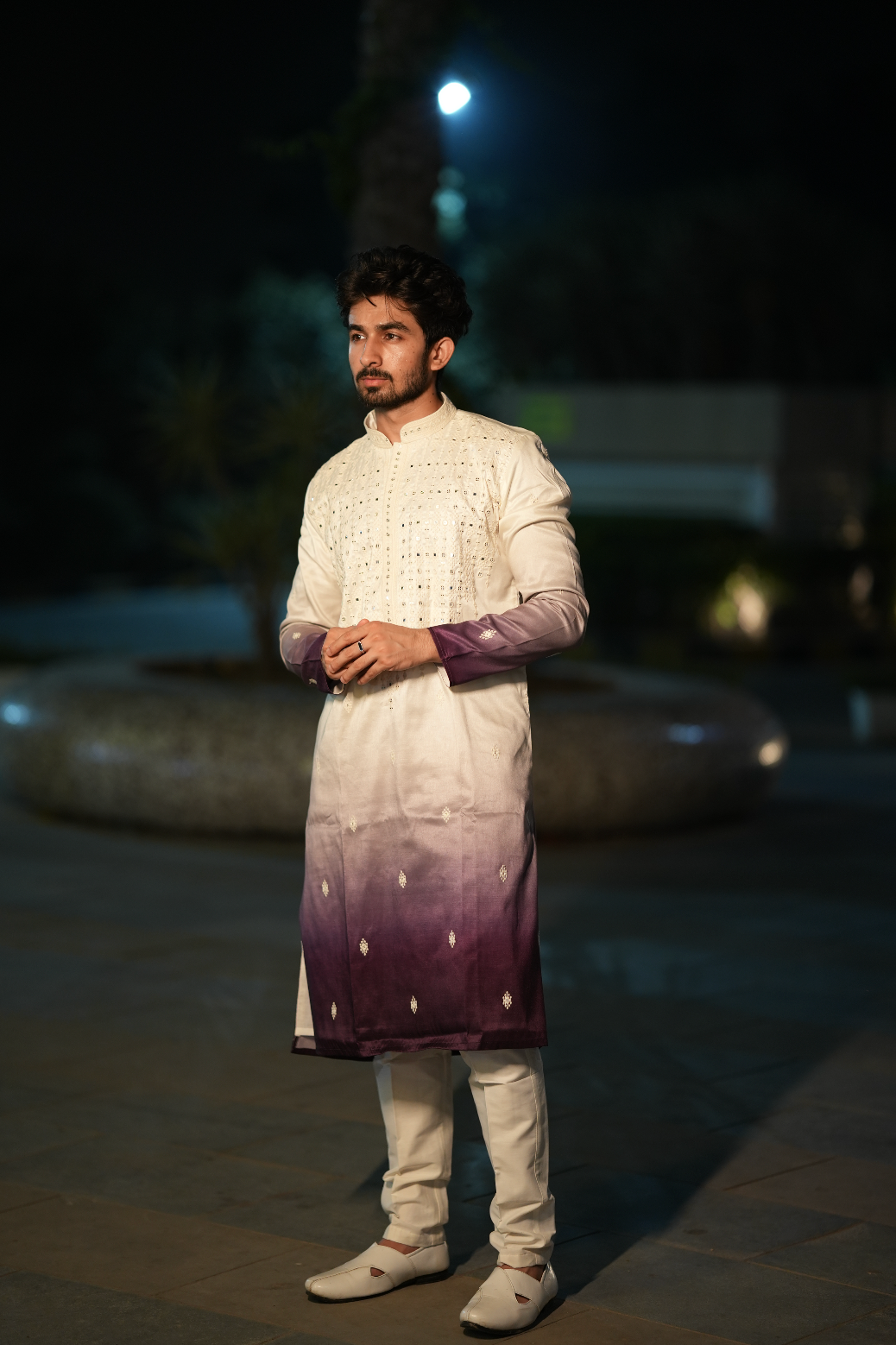 Featuring a white and purple kurta in silk base with hand and machine embroidery. It is paired with pyjama pants. Perfect attire for any festive occasion, exuding traditional charm and elegance.