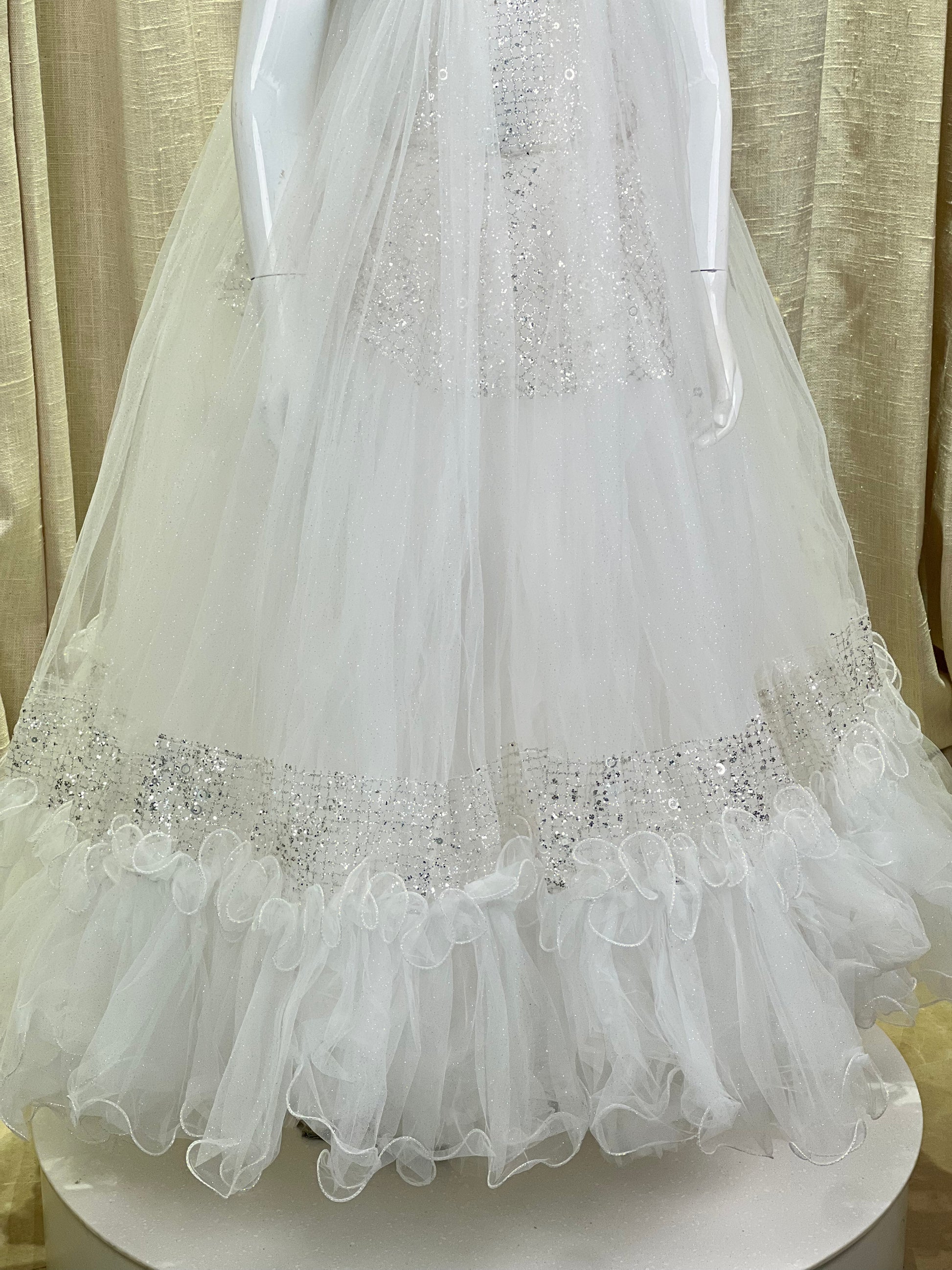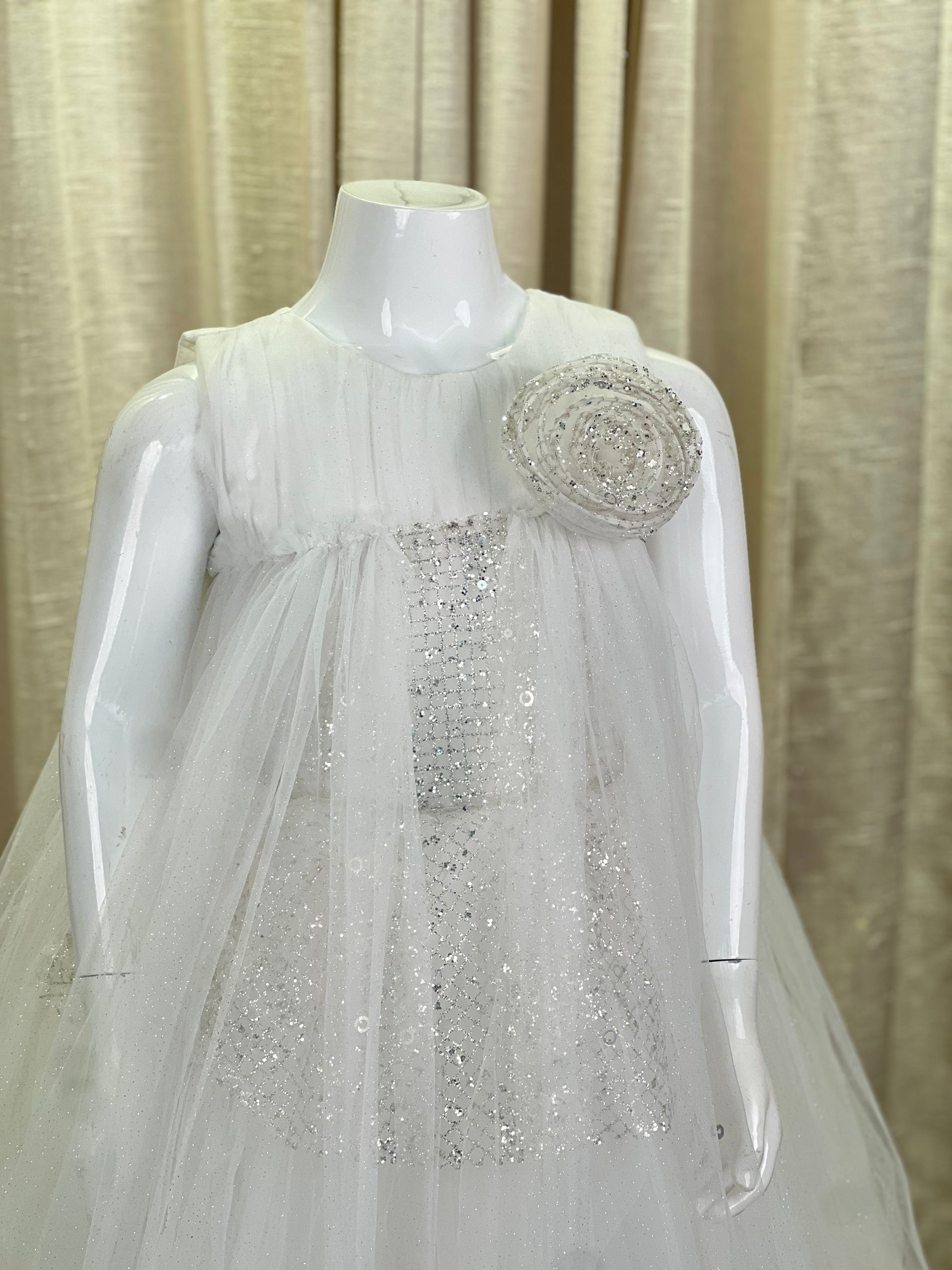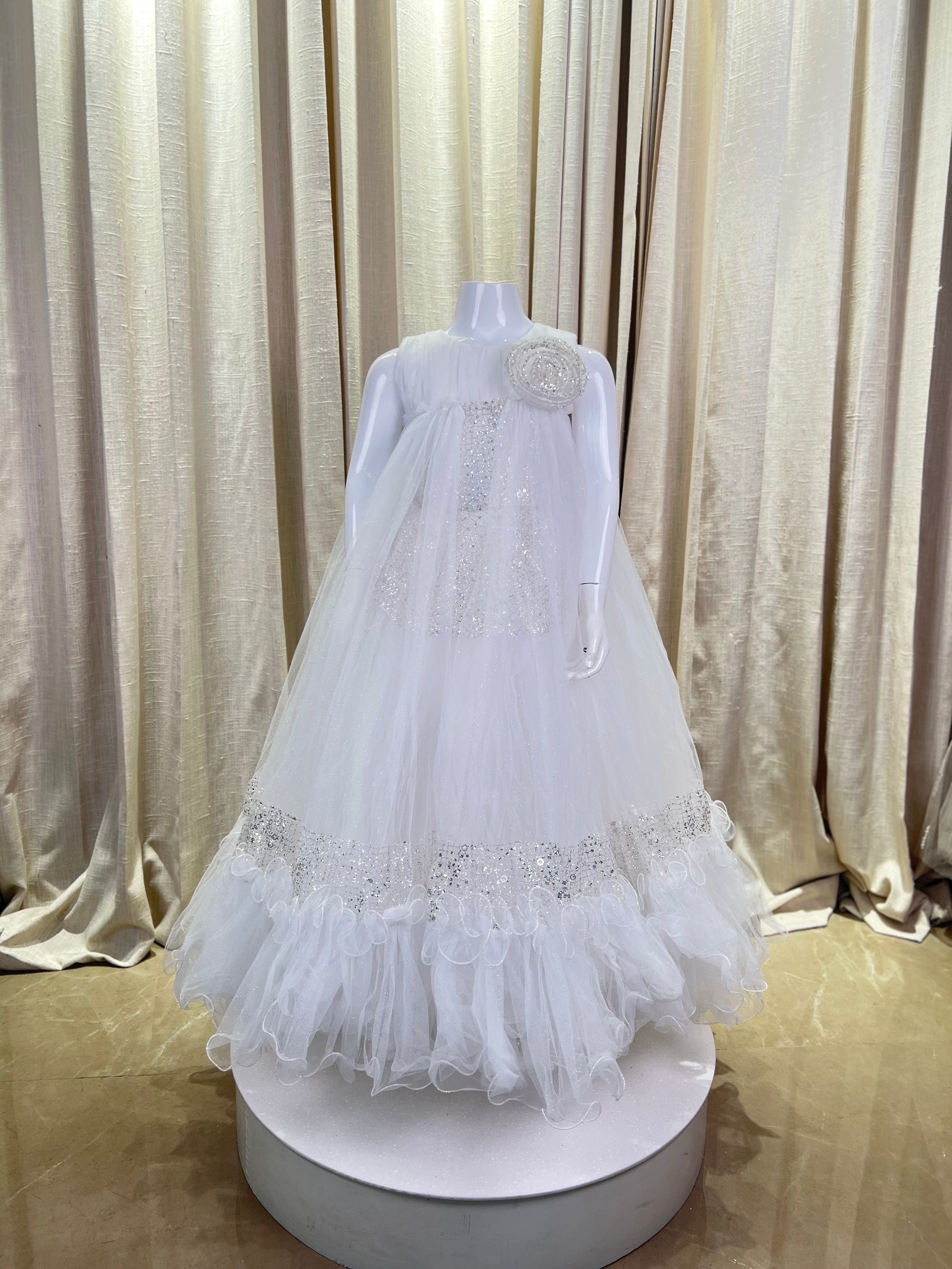 Graceful and elegant, this white sequin net gown is designed to make every occasion memorable. Crafted from premium soft net, the dress features delicate sequin embellishments and a handcrafted floral appliqué at the shoulder. The flowing layers and ruffled hem create a dreamy silhouette, perfect for birthdays, weddings, and festive celebrations. Light, comfortable, and effortlessly stylish, this gown adds a magical charm to any young wardrobe.
