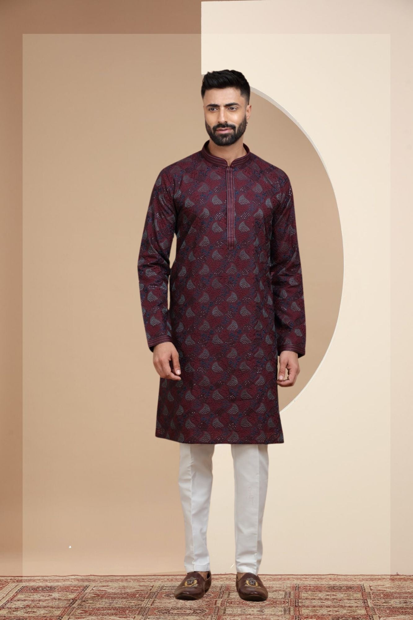 Elevate your wardrobe with this Wine Embroidered Kurta Set. The rich wine color and intricate embroidery add a touch of elegance to this traditional outfit. Perfect for any special occasion, it's sure to turn heads and make you feel confident and stylish. Cheers to great style!