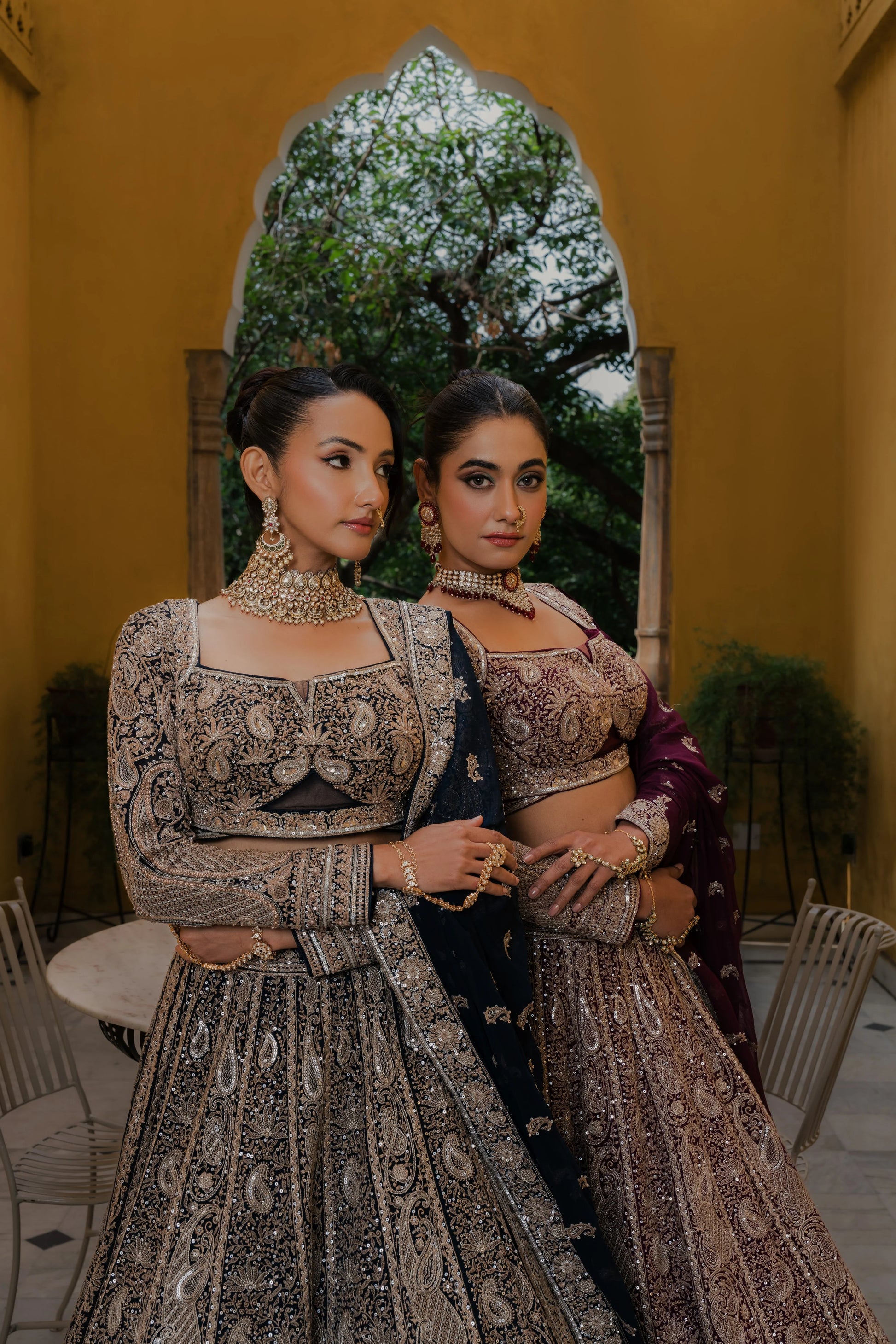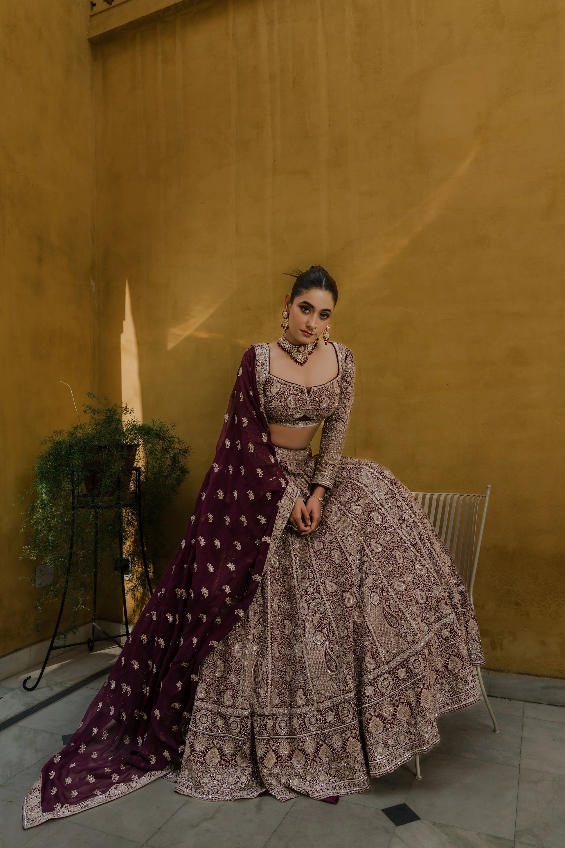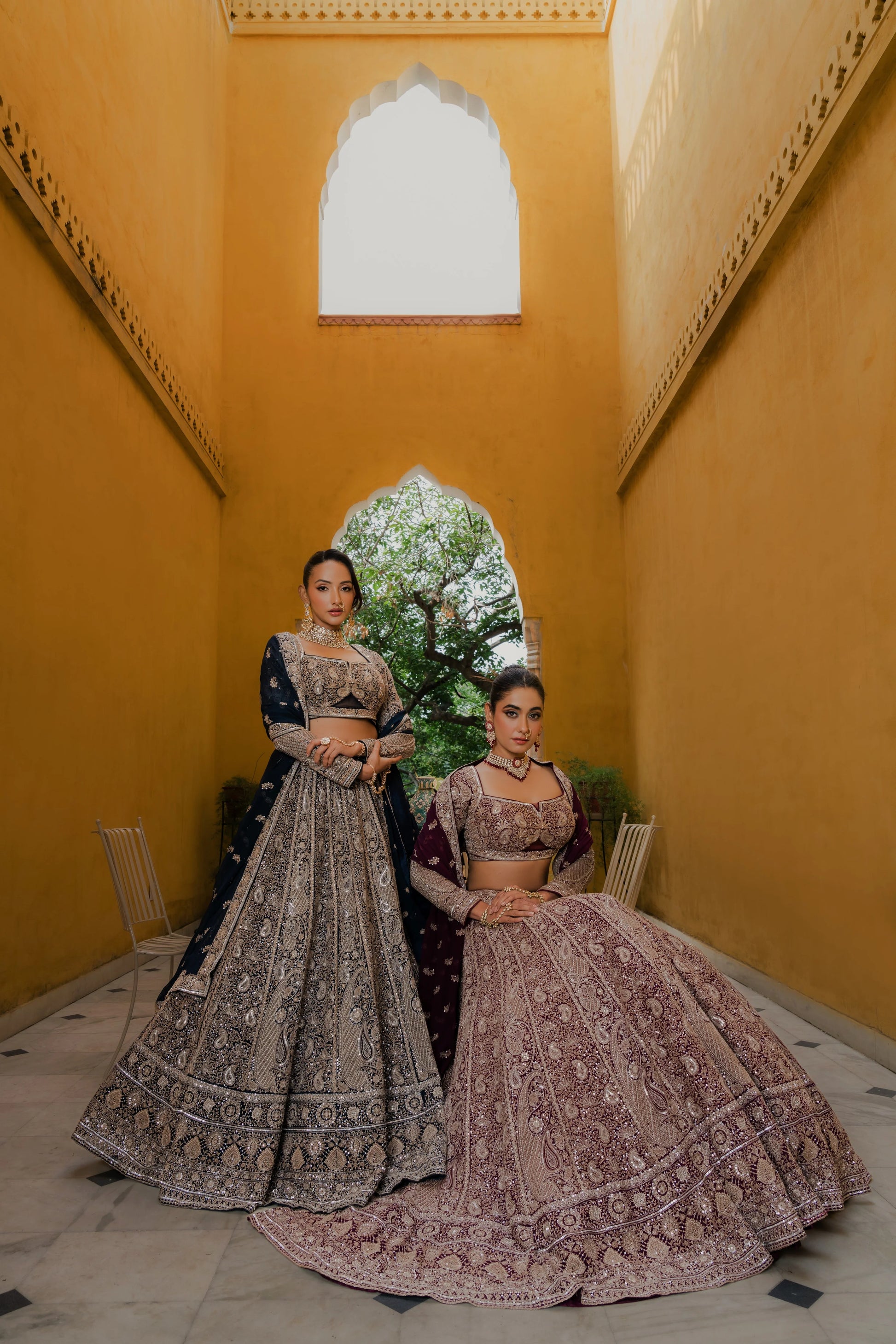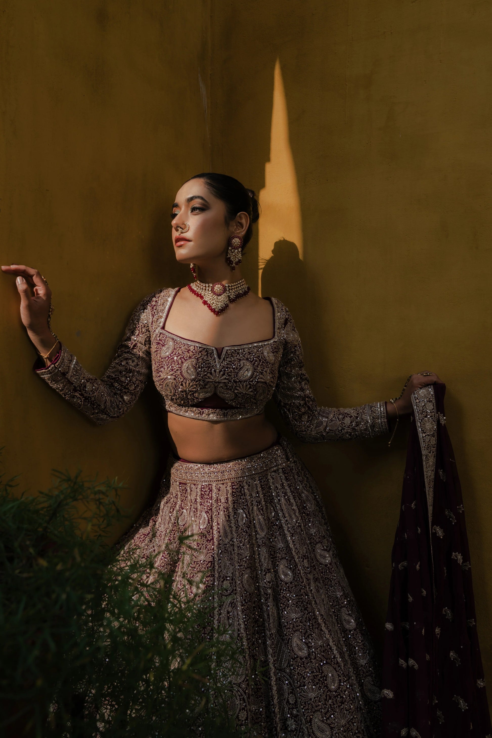 Indulge in the opulence of heritage craftsmanship with this Wine lehenga set, a striking ensemble that speaks volumes of regal grandeur. Rendered in plush Georgette, the flared skirt is densely adorned with golden zardosi work, intricate paisley patterns, and glimmering sequins, forming a tapestry of Mughal-inspired artistry.