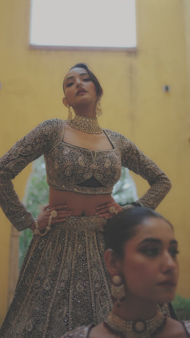 Completing the set is a dupatta in Wine, delicately sprinkled with floral motifs and framed by a zari-embroidered border. Styled here with a layered polki choker and chandelier earrings, this lehenga is a showstopper fit for receptions, sangeets, or statement bridal moments.