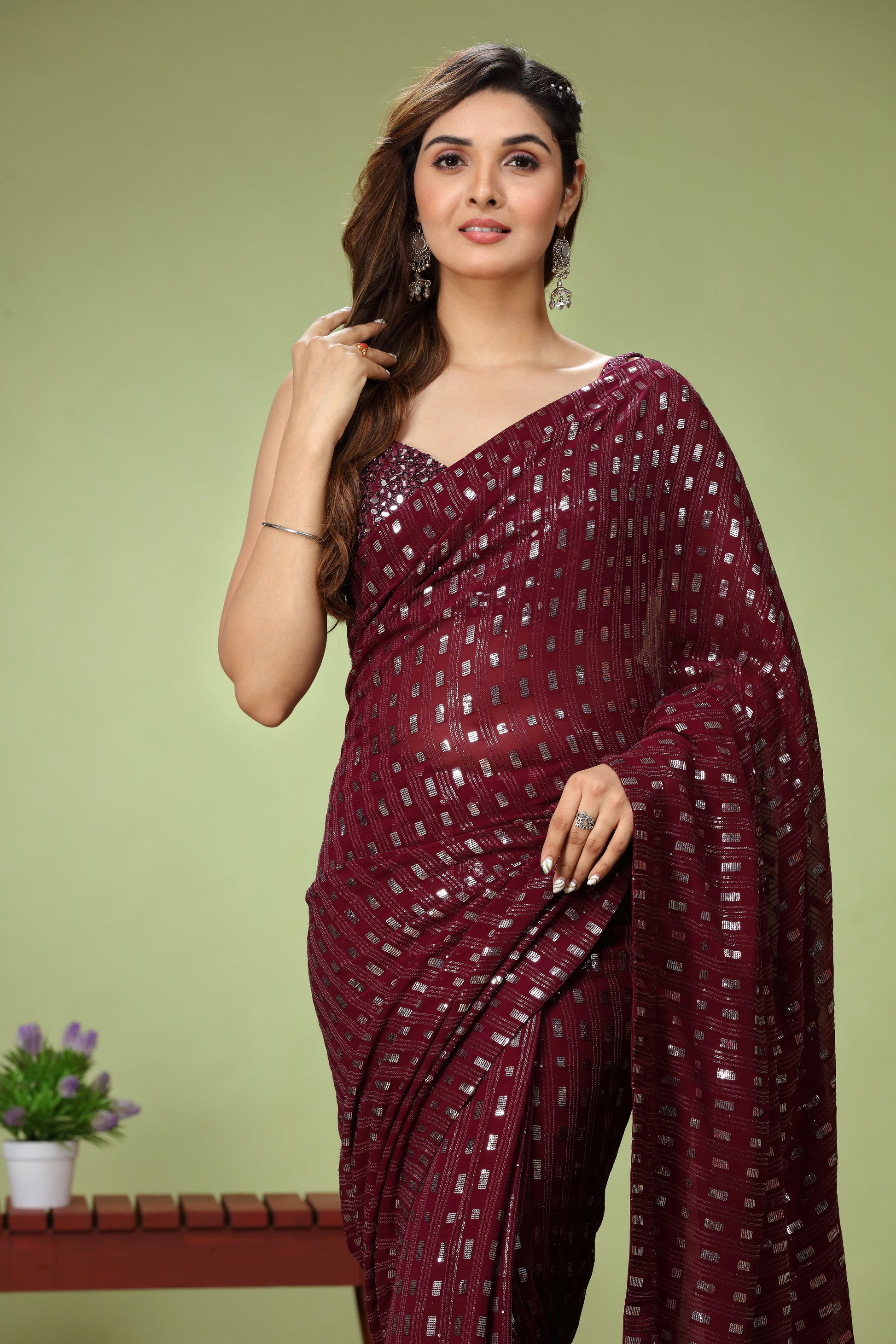 Get ready to turn heads with our Wine sequinned Pure Georgette saree! This elegant saree combines stunning sequins with lightweight and delicate Georgette fabric for a glamorous and comfortable look. Perfect for weddings, parties, or any special occasion. Cheers to style!