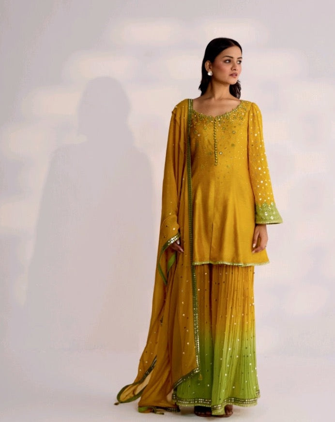 A yellow designer sharara for women is a radiant choice, adorned with captivating designs that exude charm. Paired with a complementary dupatta in green shades, it offers a harmonious contrast. Perfect for festive occasions or cultural celebrations, this ensemble embodies elegance and style, ensuring you stand out with its vibrant appeal.