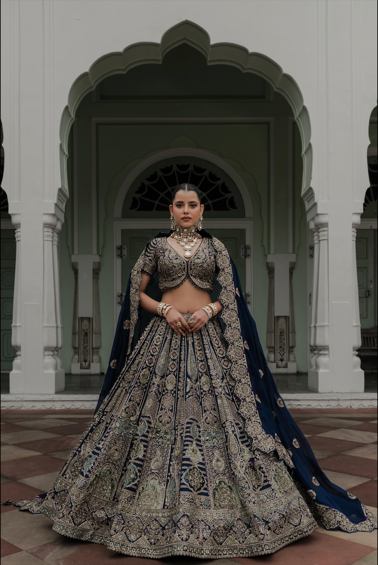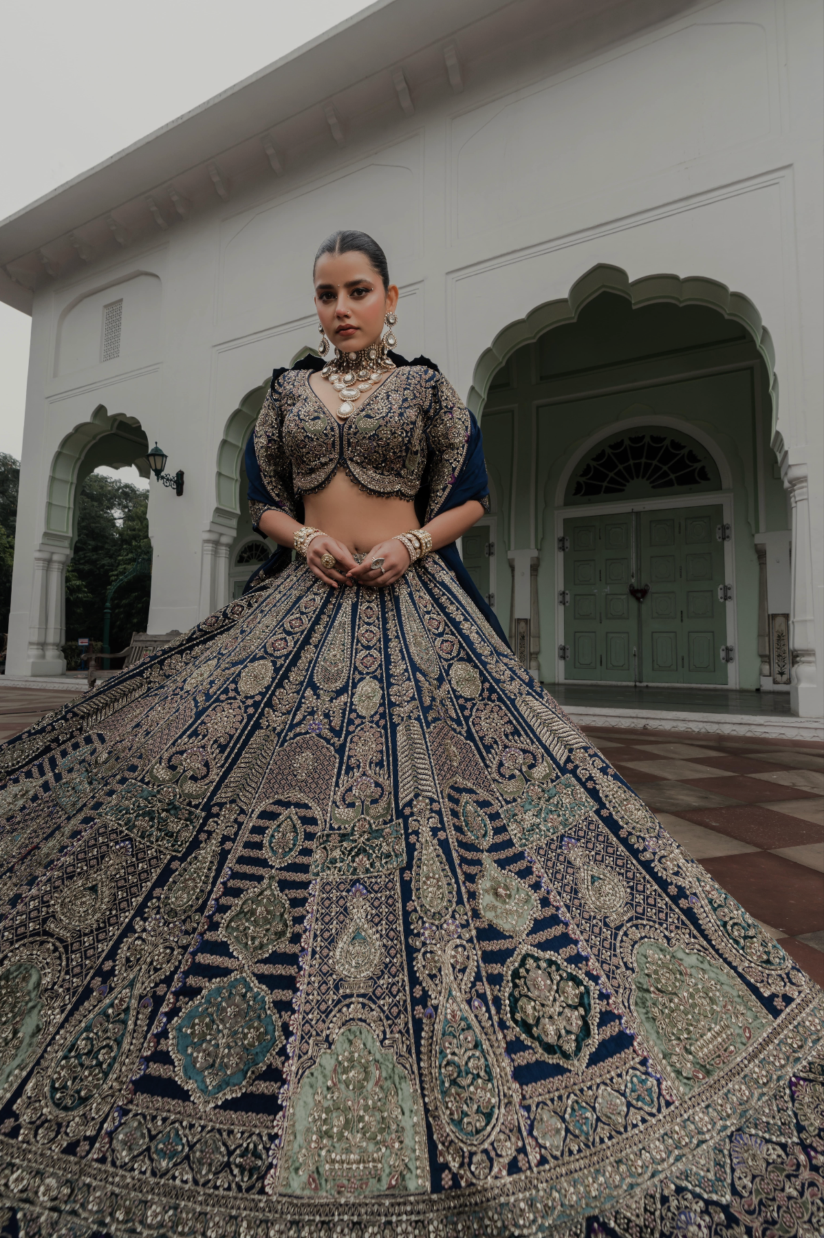 Zariah Teal Blue Velvet Zardosi Lehenga